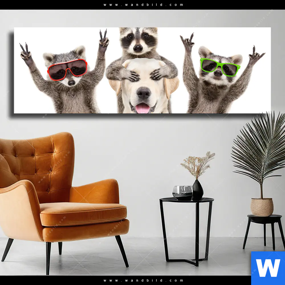 Leinwandbild | Lustige Waschbären mit Hund | Panorama