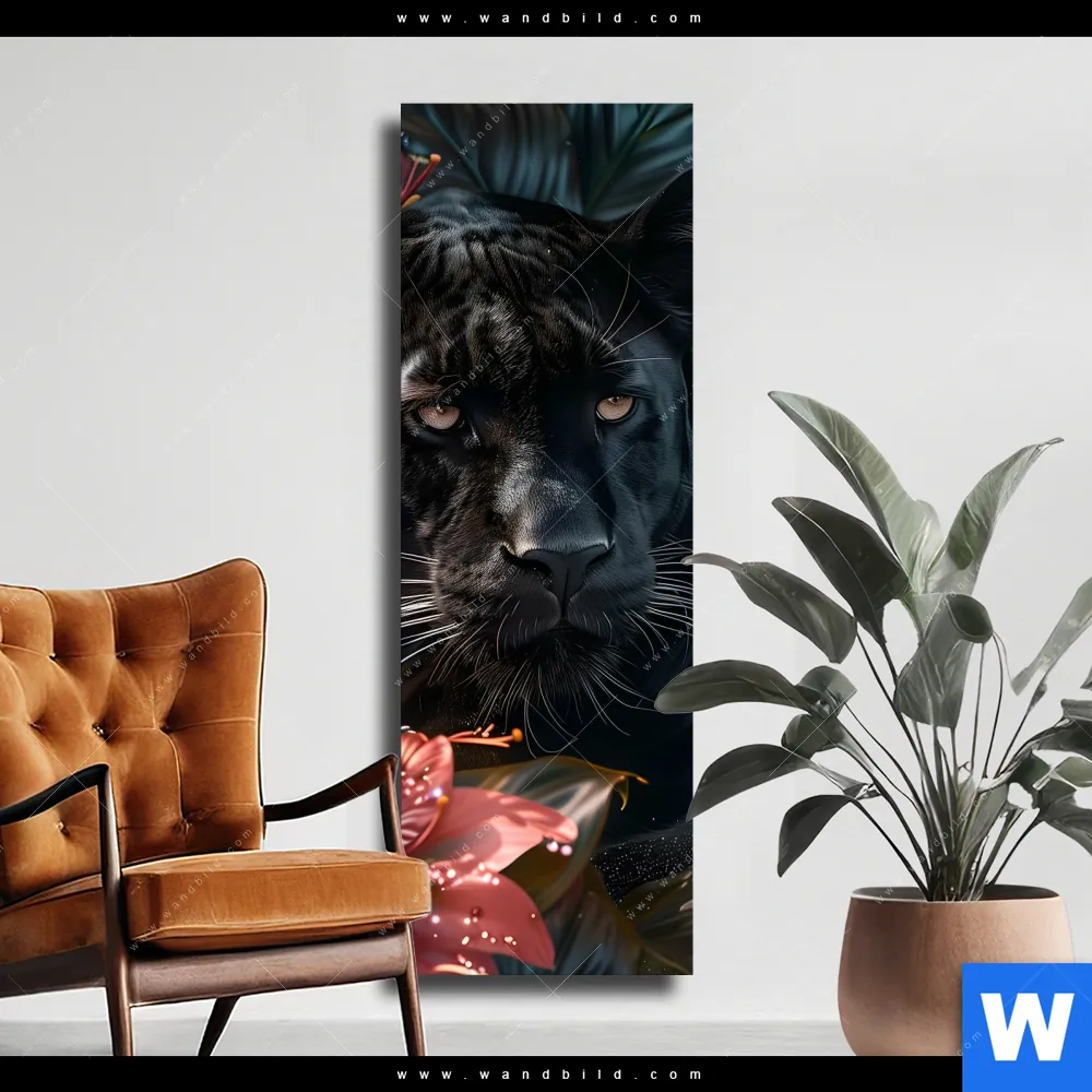 Leinwandbild | Panther und rote Blüten | Schmal