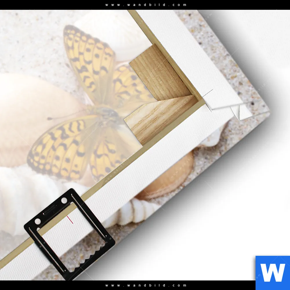 Leinwandbild | Schmetterlinge & Muscheln im Sand | Panorama