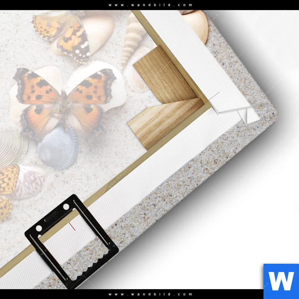 Leinwandbild | Schmetterlinge & Muscheln im Sand | Quadrat