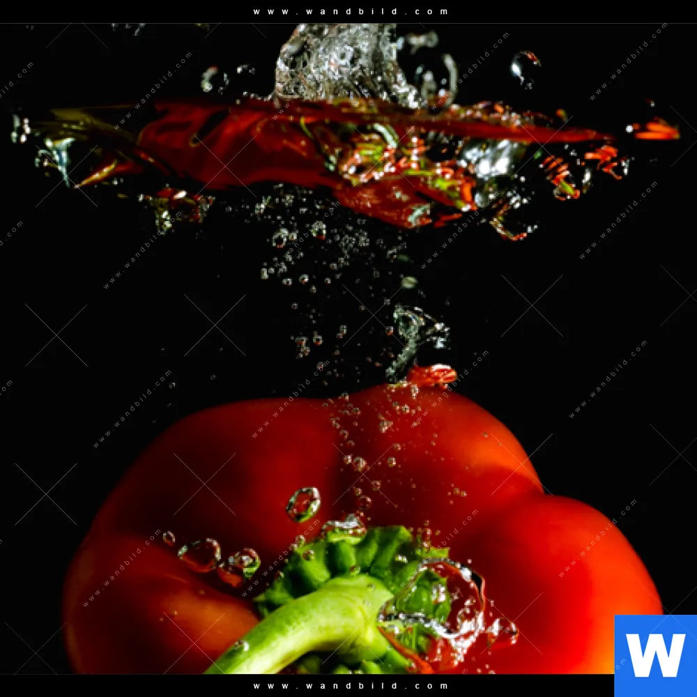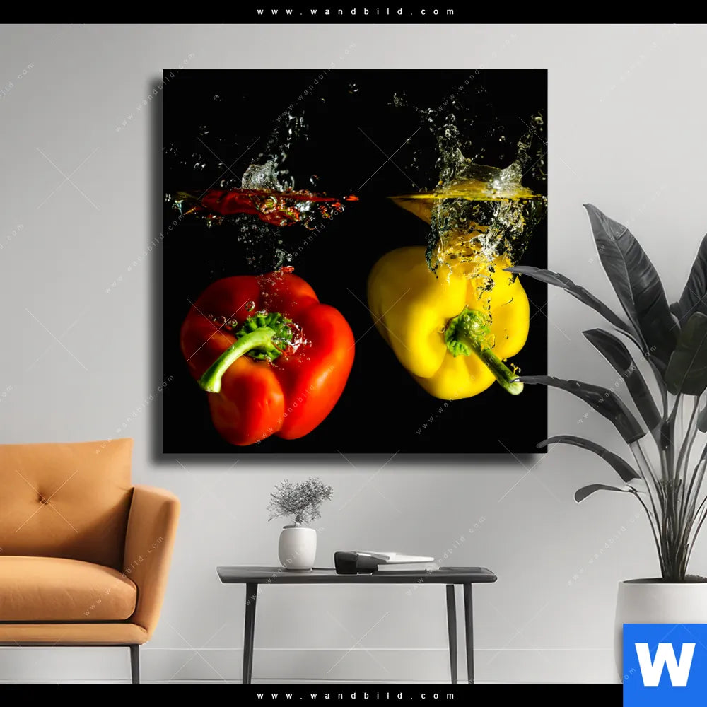 Leinwandbild | Spritzer von Paprika beim fallen ins Wasser | Quadrat
