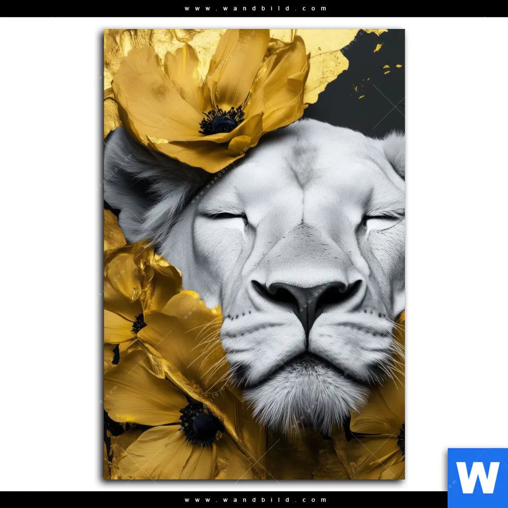 Leinwandbild | Weiße Löwin mit Goldblüten | Hochformat