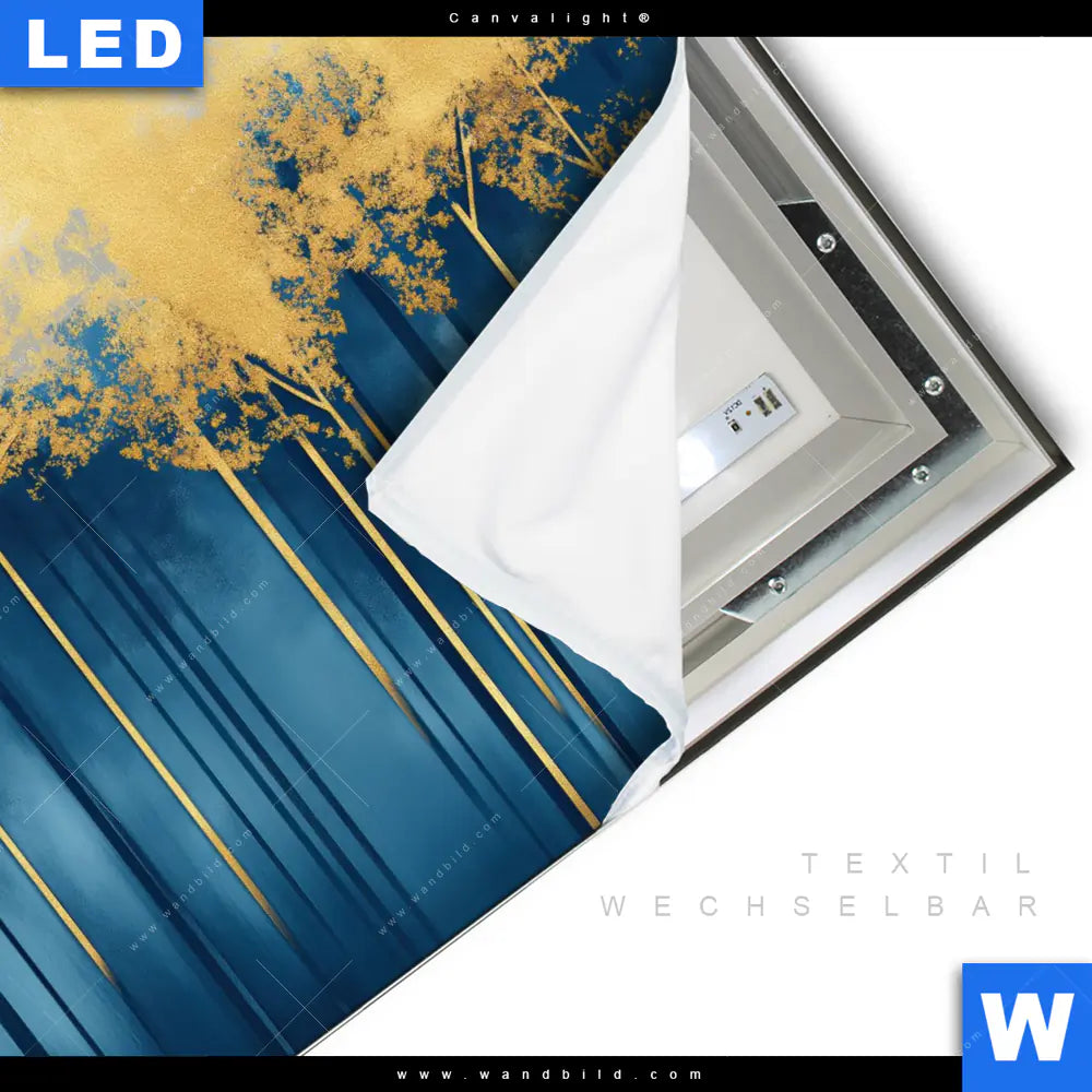 Canvalight® TEX Leuchtbild | Abstrakter Wald - Blau & Gold | Quadrat