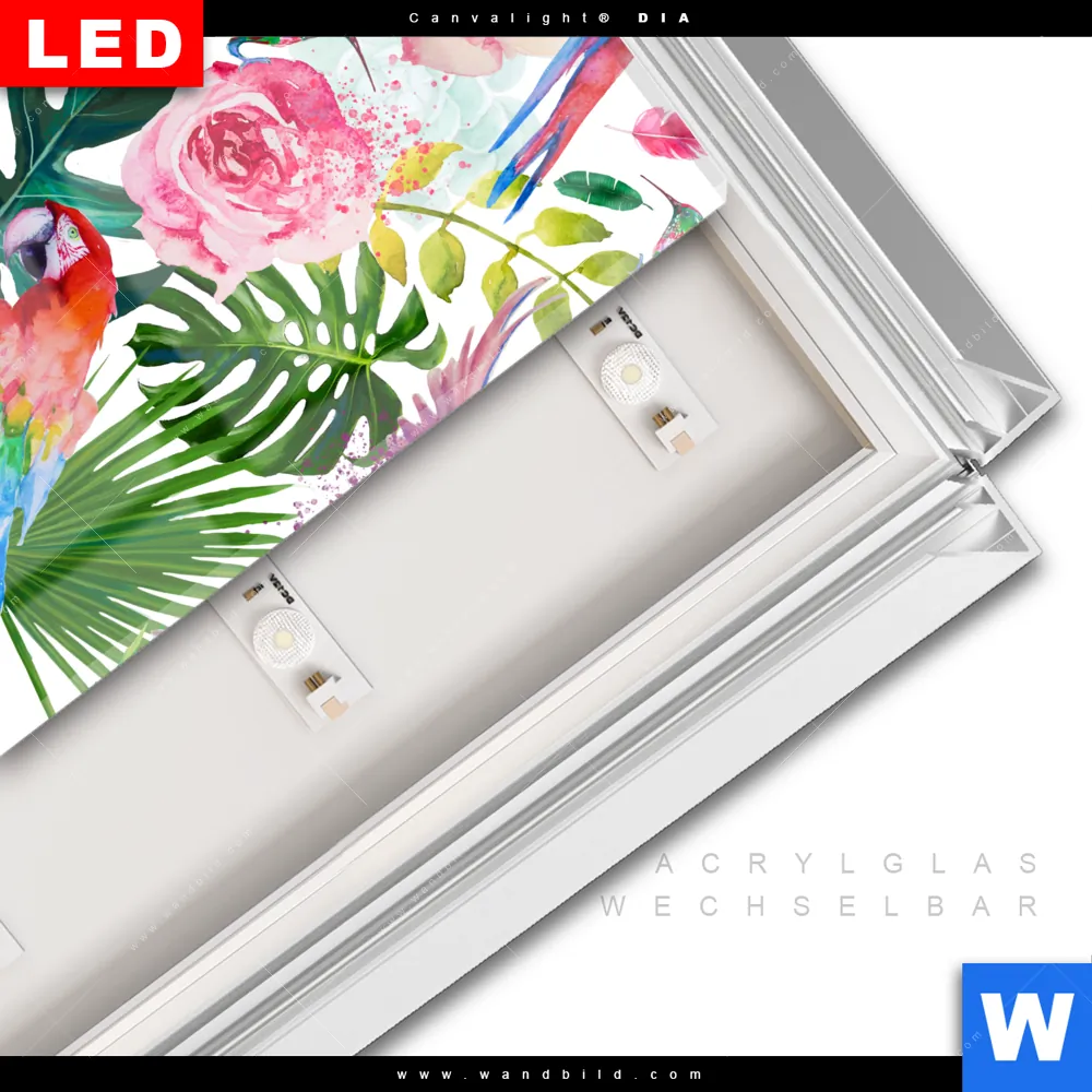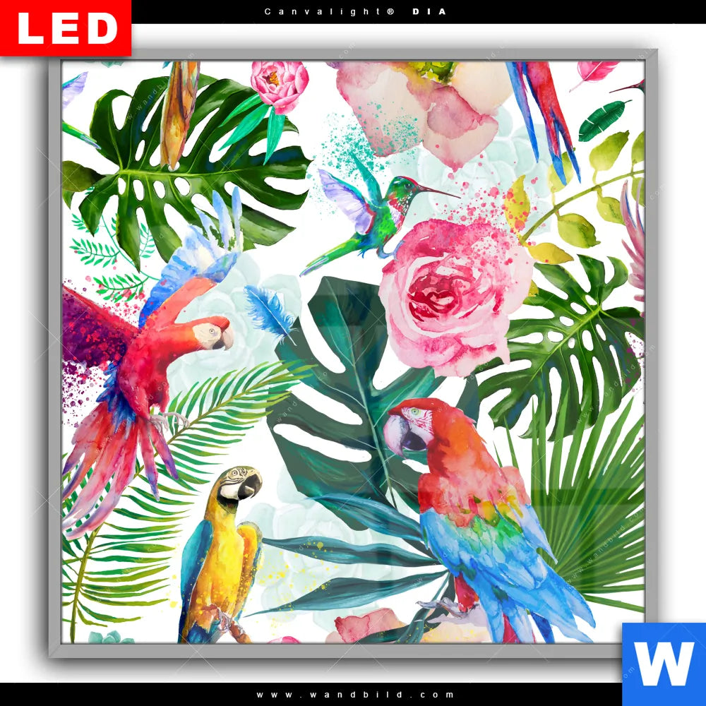 Canvalight® DIA Leuchtbild | Blumen & Papageien Aquarell | Quadrat