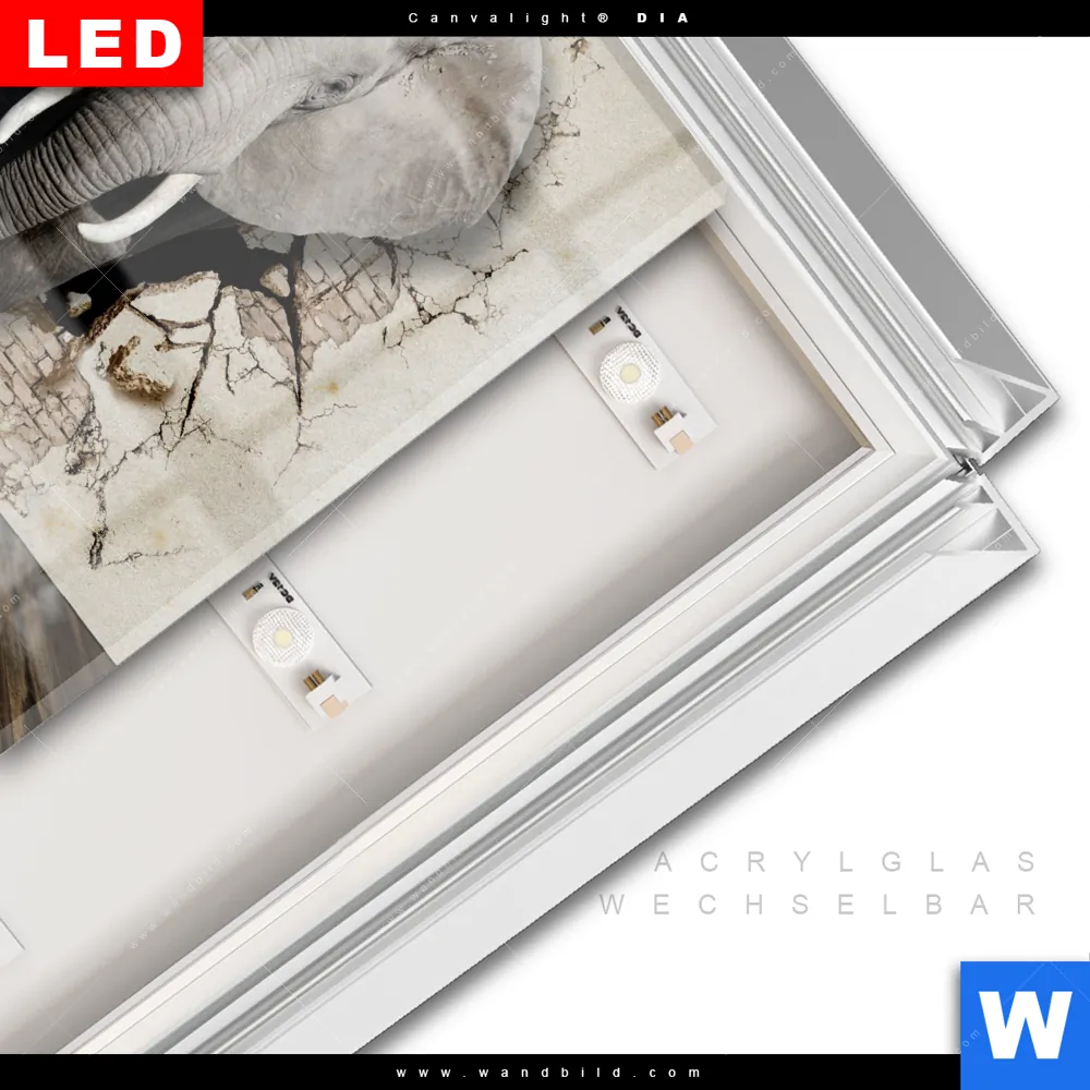 Canvalight® DIA Leuchtbild | Elefant bricht durch Mauer | Quadrat