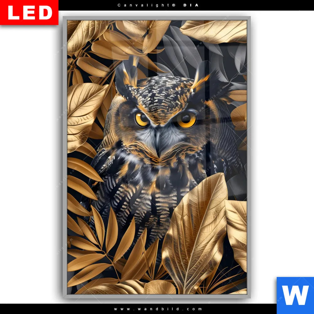 Leuchtbild Acrylglas Canvalight® DIA | Eule und goldene Blätter | Hochformat