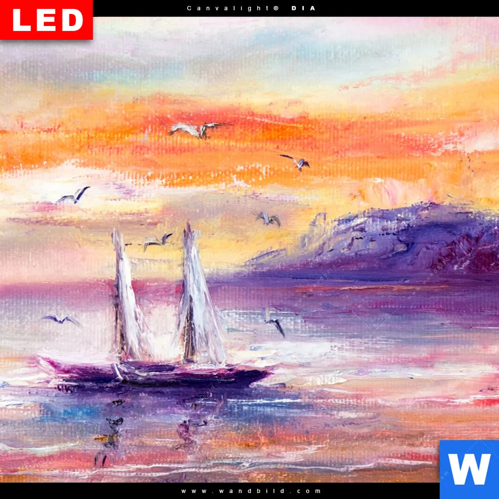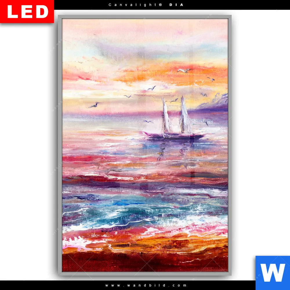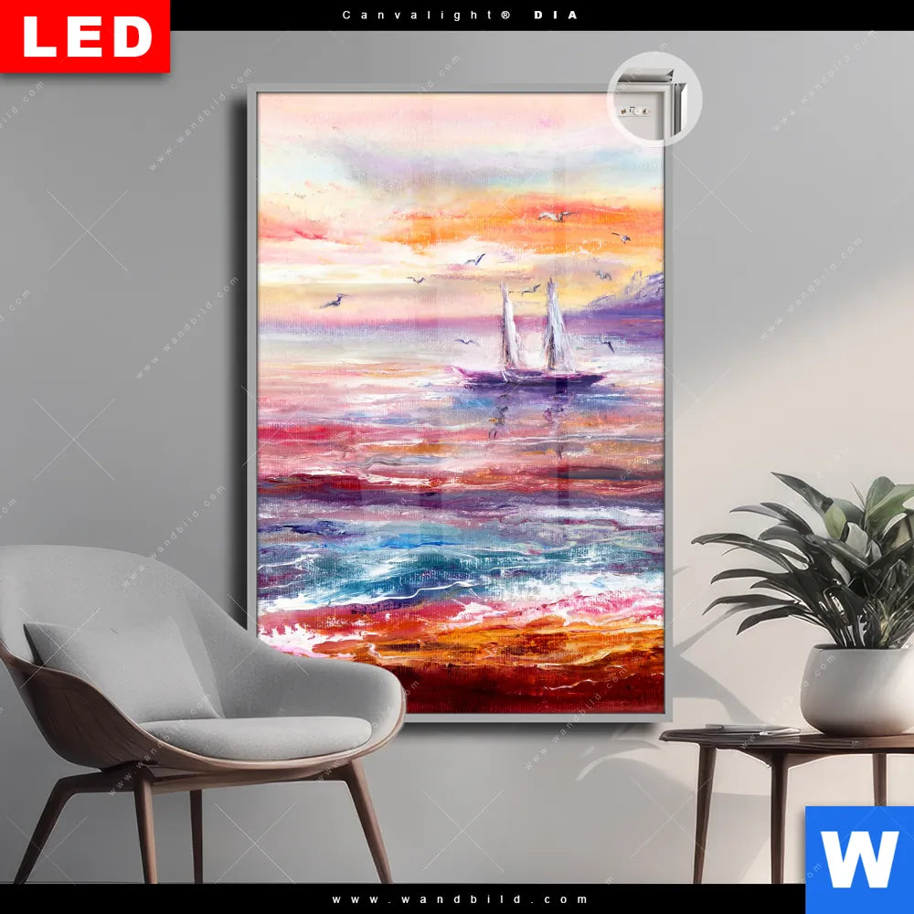 Canvalight® DIA Leuchtbild | Gemälde mit Boot im Sonnenuntergang | Hochformat