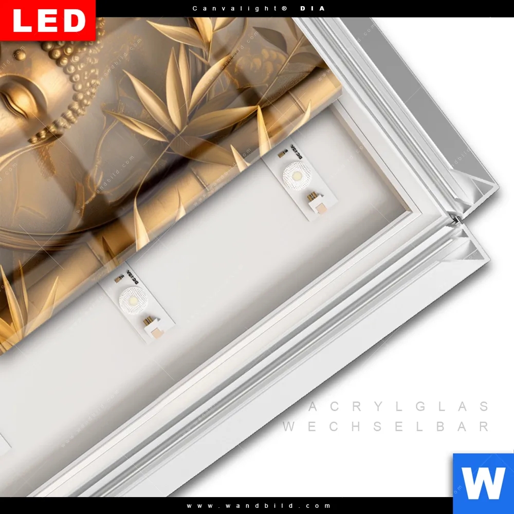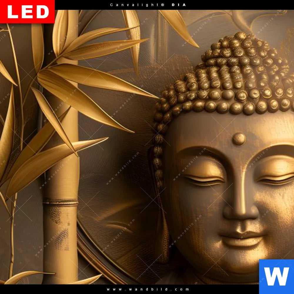 Canvalight® DIA Leuchtbild | Goldener Buddha im Bambuswald | Hochformat