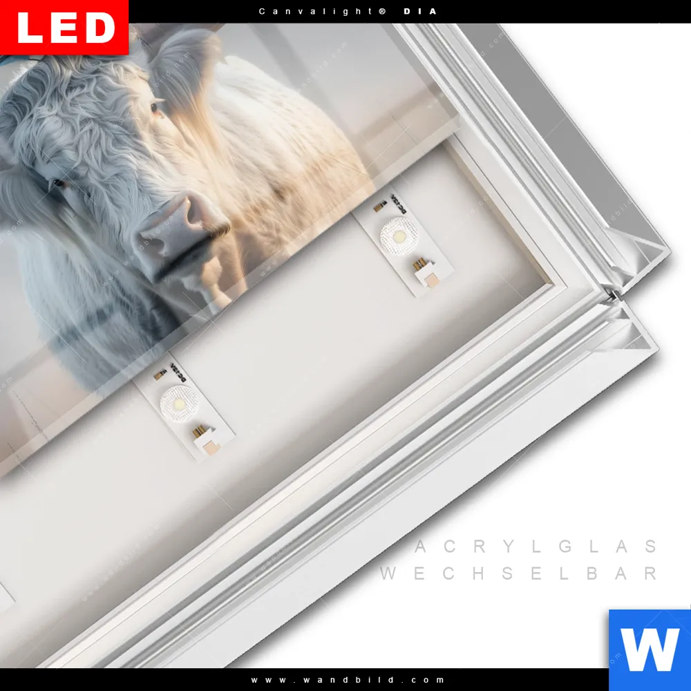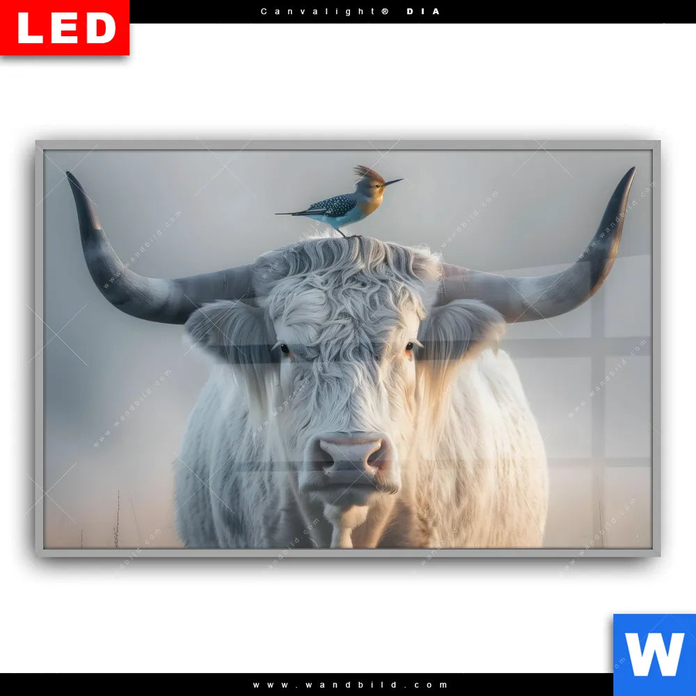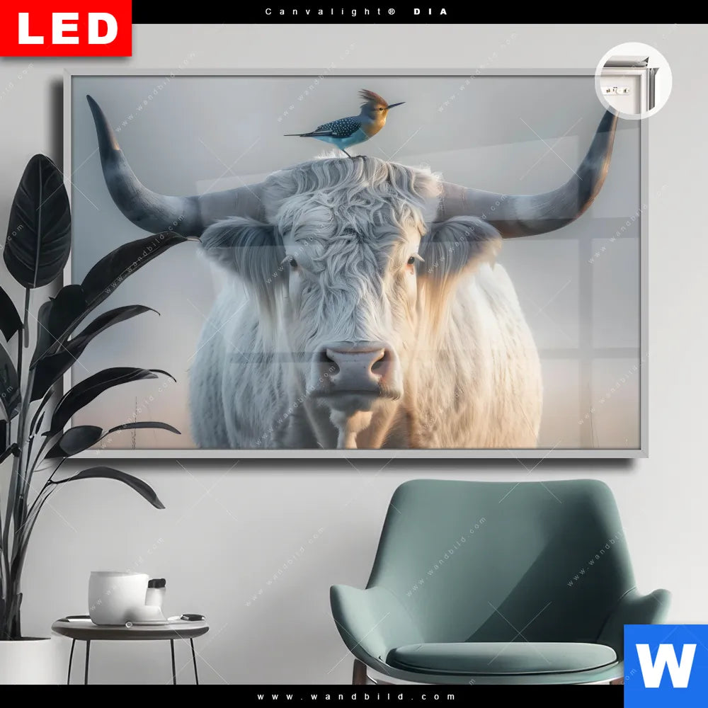 Canvalight® DIA Leuchtbild | Hochlandrind & bunter Vogel | Querformat