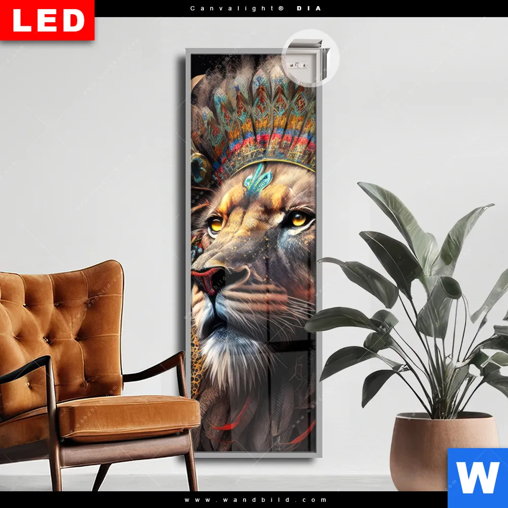 Canvalight® DIA Leuchtbild | Löwenkopf mit bunten Federn | Schmal