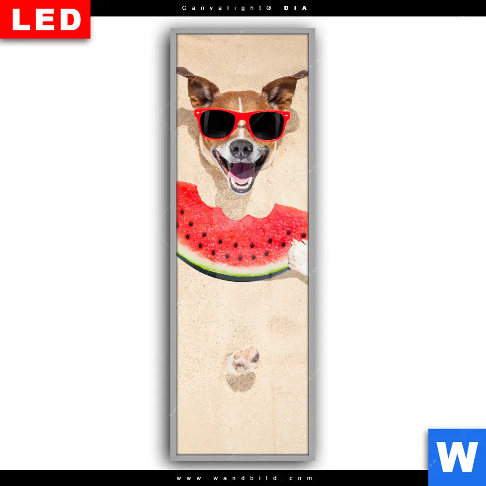 Canvalight® DIA Leuchtbild | Lustiger Hund am Strand | Schmal