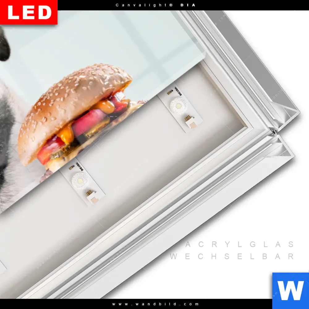 Canvalight® DIA Leuchtbild | Lustiger Hund mit Burger | Panorama