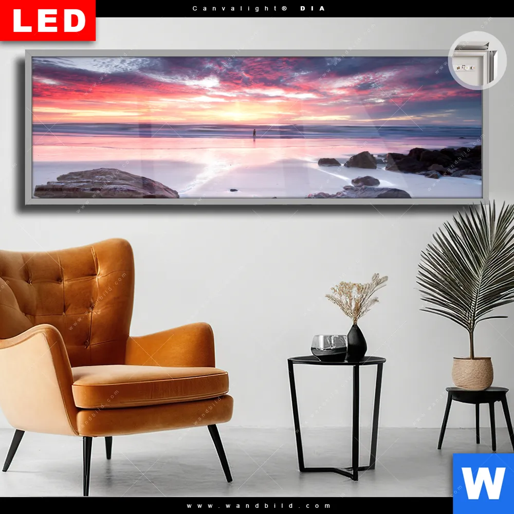 Canvalight® DIA Leuchtbild | Sonnenaufgang am Strand mit Felsen | Panorama