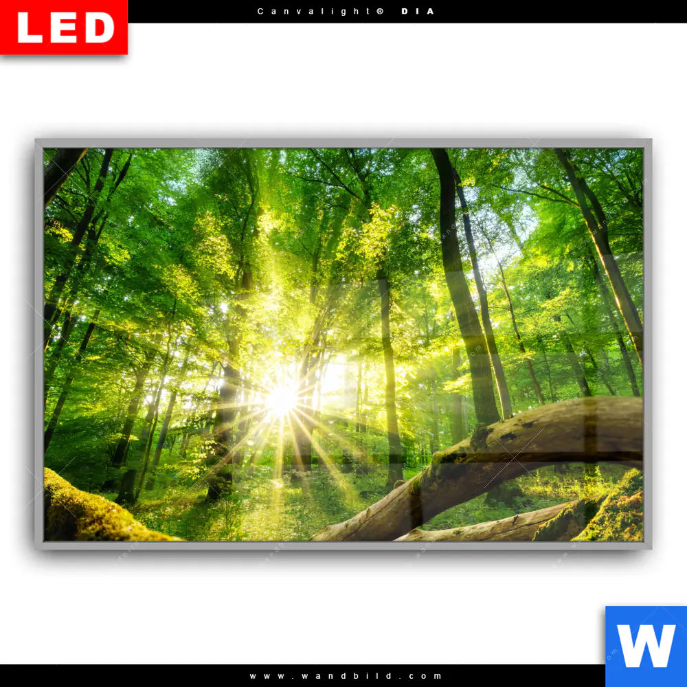 Canvalight® DIA Leuchtbild | Sonnenstrahlen im dichten Wald | Querformat