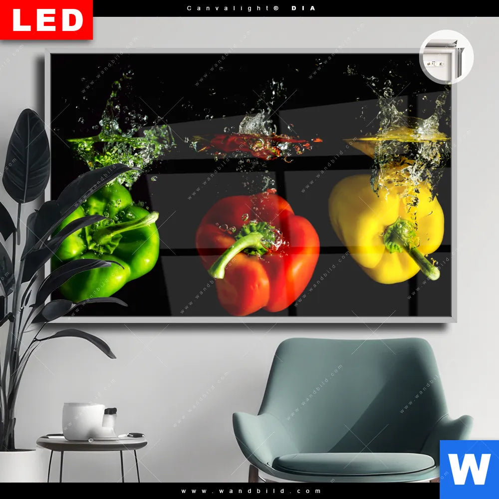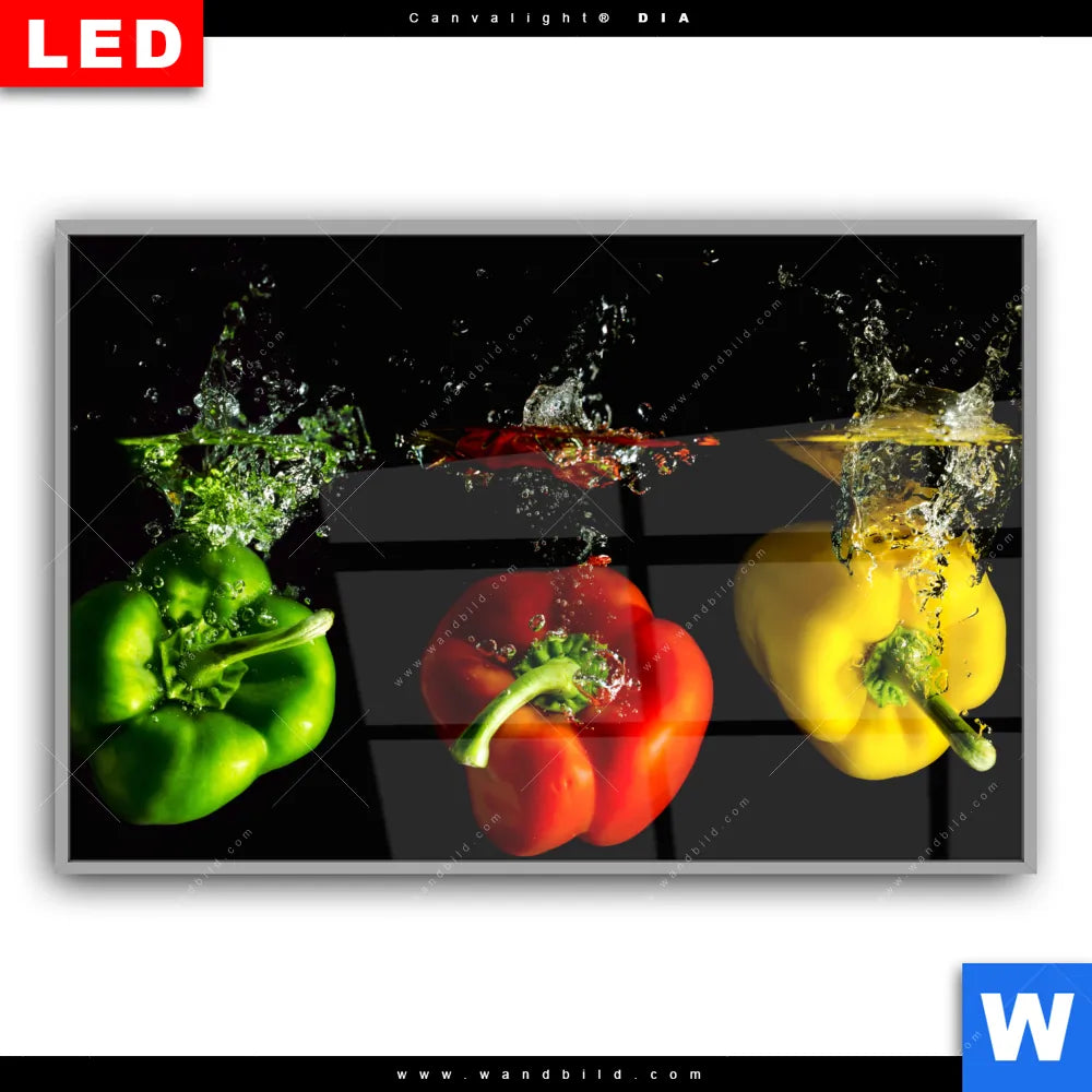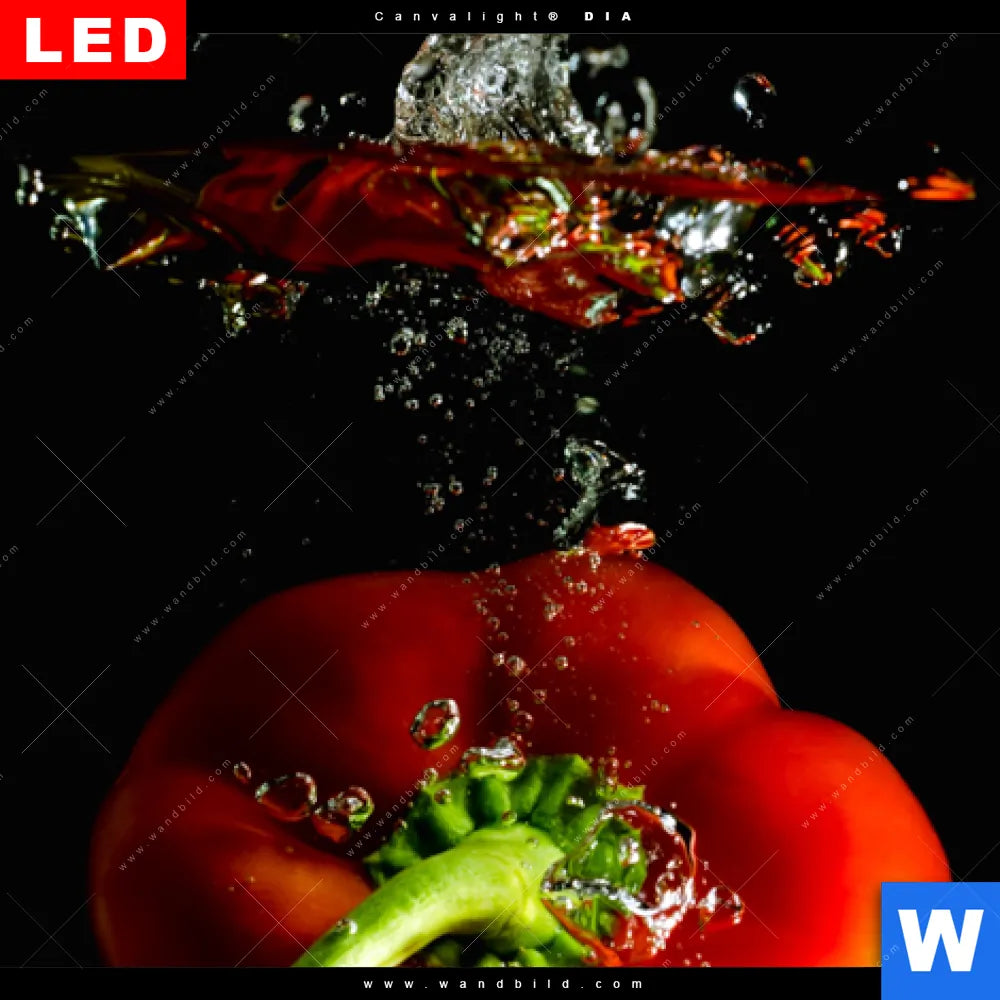 Canvalight® DIA Leuchtbild | Spritzer von Paprika beim fallen ins Wasser | Querformat