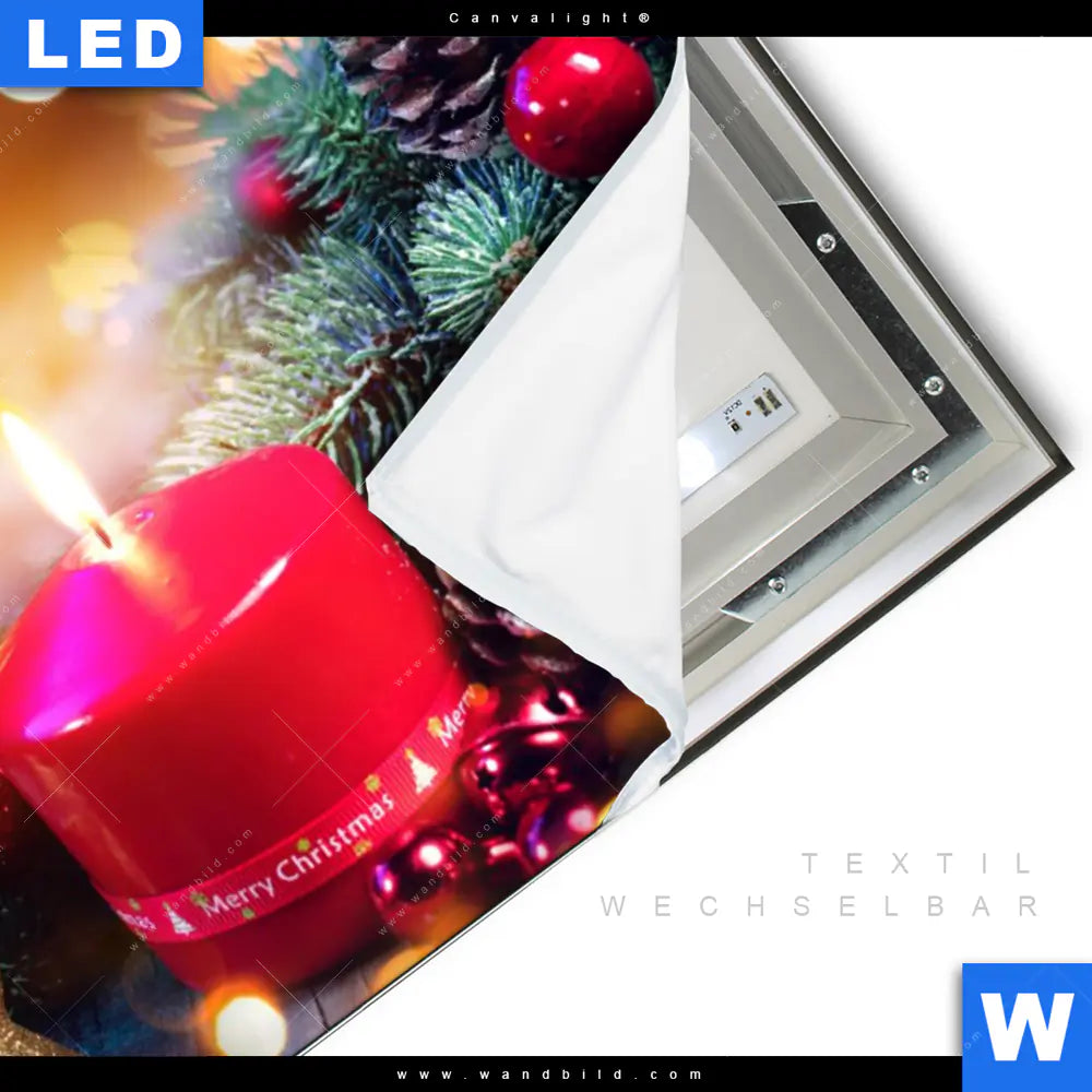 Canvalight® TEX Leuchtbild | Adventskerze mit Weihnachtsschmuck | Querformat