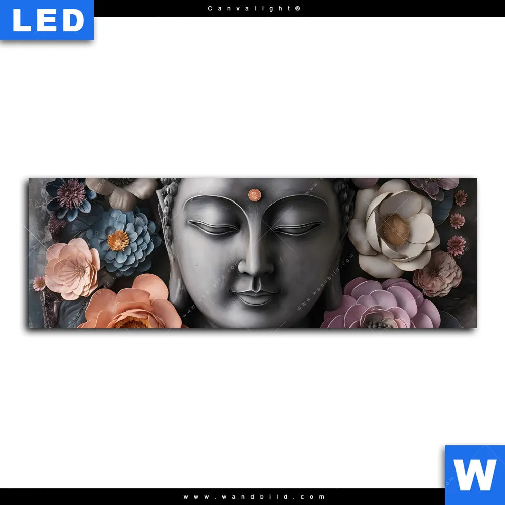 Canvalight® TEX Leuchtbild | Buddha-Kunst mit Pastellblüten | Panorama