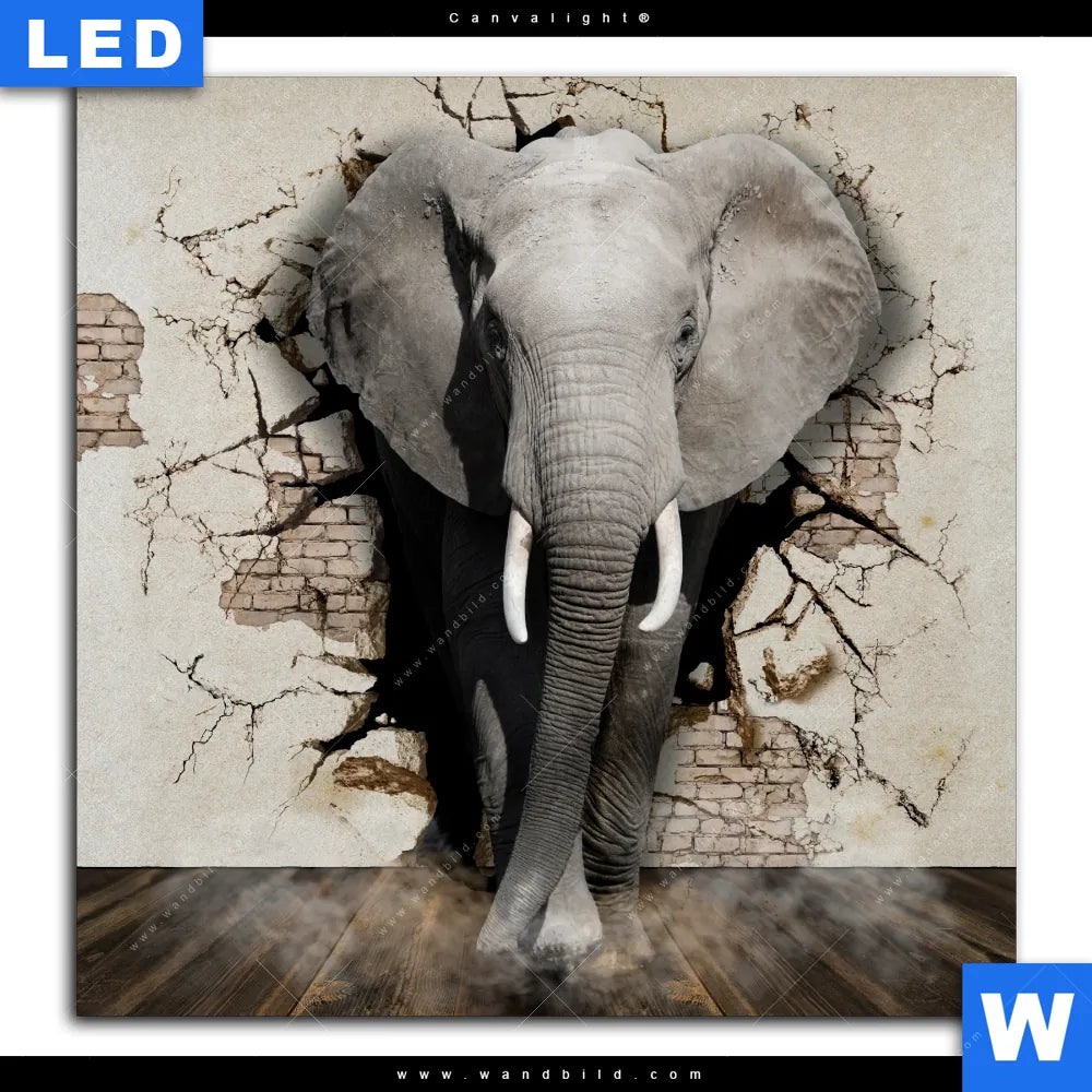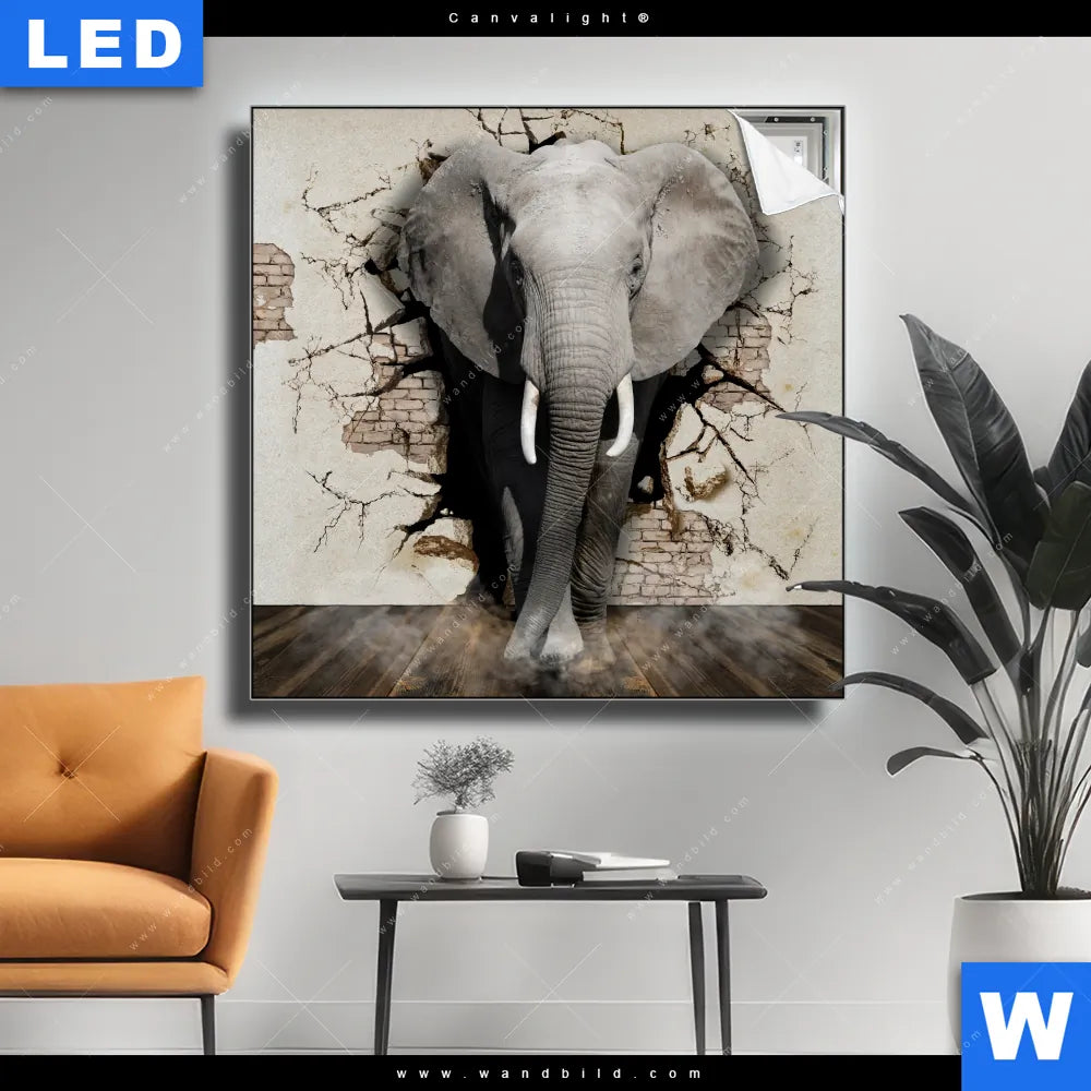 Canvalight® Leuchtbild | Elefant bricht durch Mauer | Quadrat