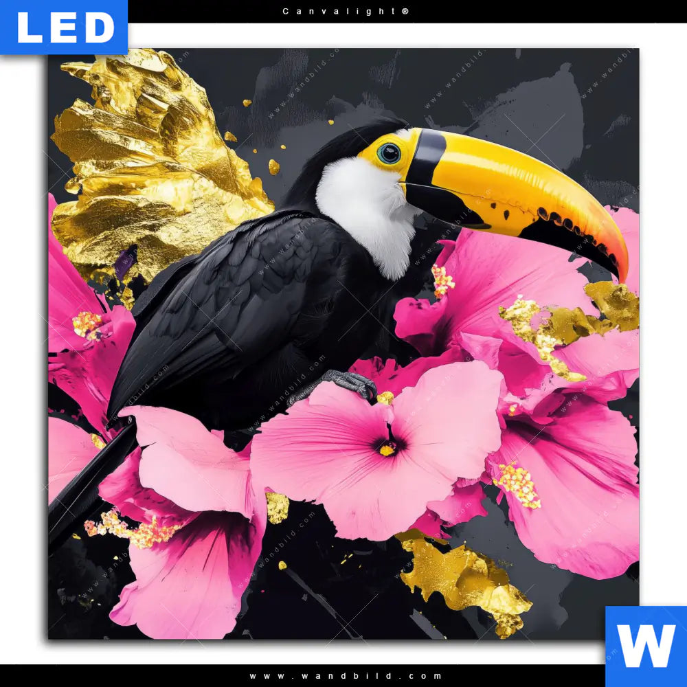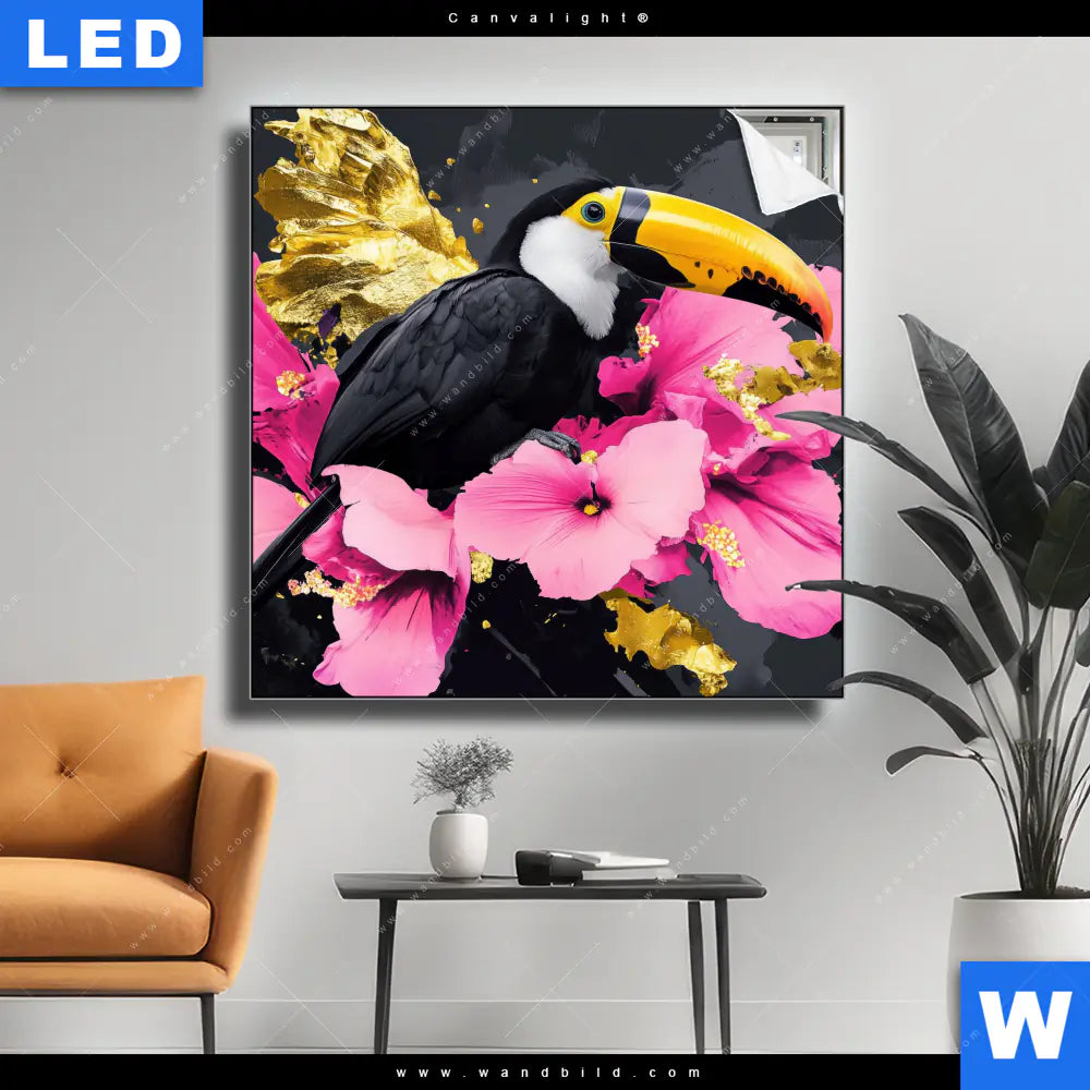 Canvalight® Leuchtbild | Exotischer Tukan mit Blüten | Quadrat