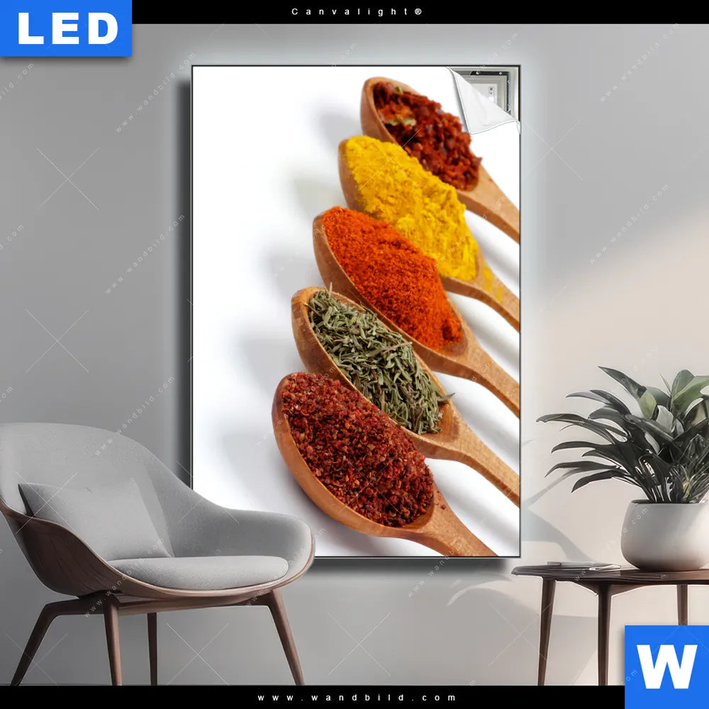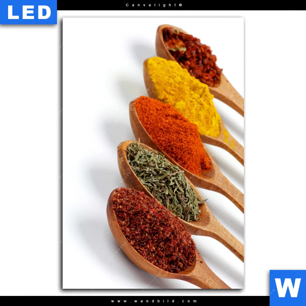 Canvalight® Leuchtbild | Farbige Gewürze auf Holzlöffel | Hochformat