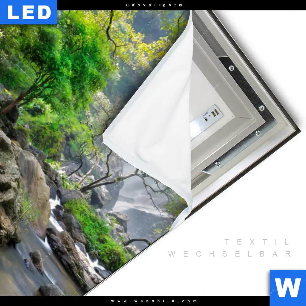 Canvalight® TEX Leuchtbild | Felsenbach im Regenwald | Hochformat