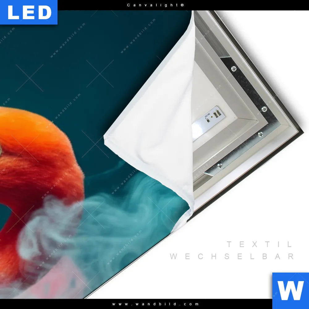 Canvalight® TEX Leuchtbild | Flamingo in bunter Rauchwolke | Schmal
