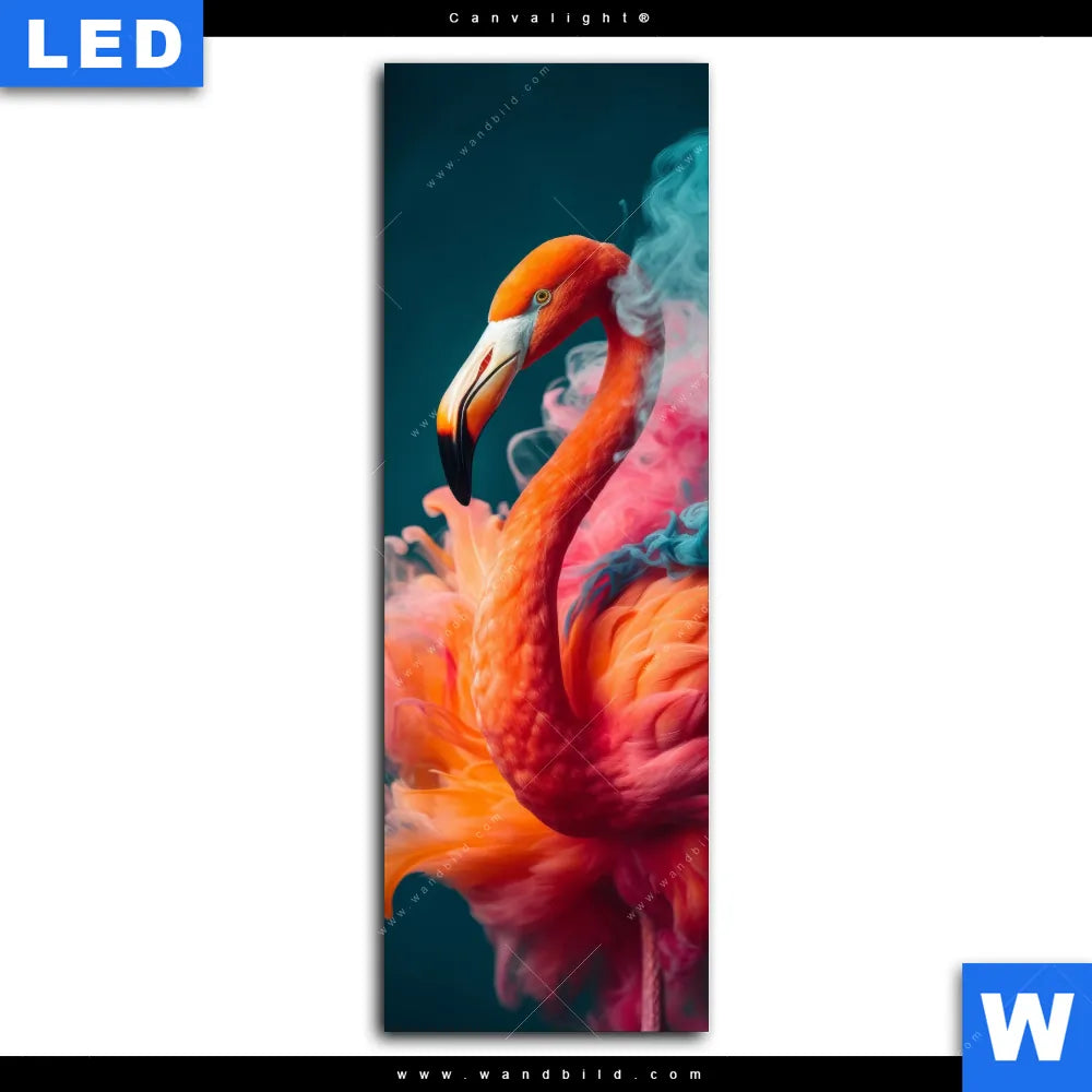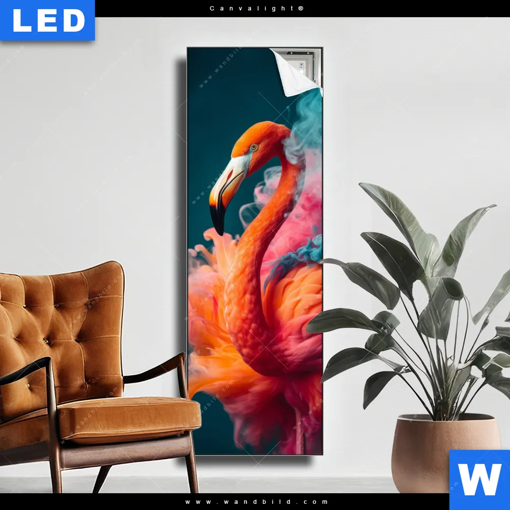 Canvalight® Leuchtbild | Flamingo in bunter Rauchwolke | Schmal