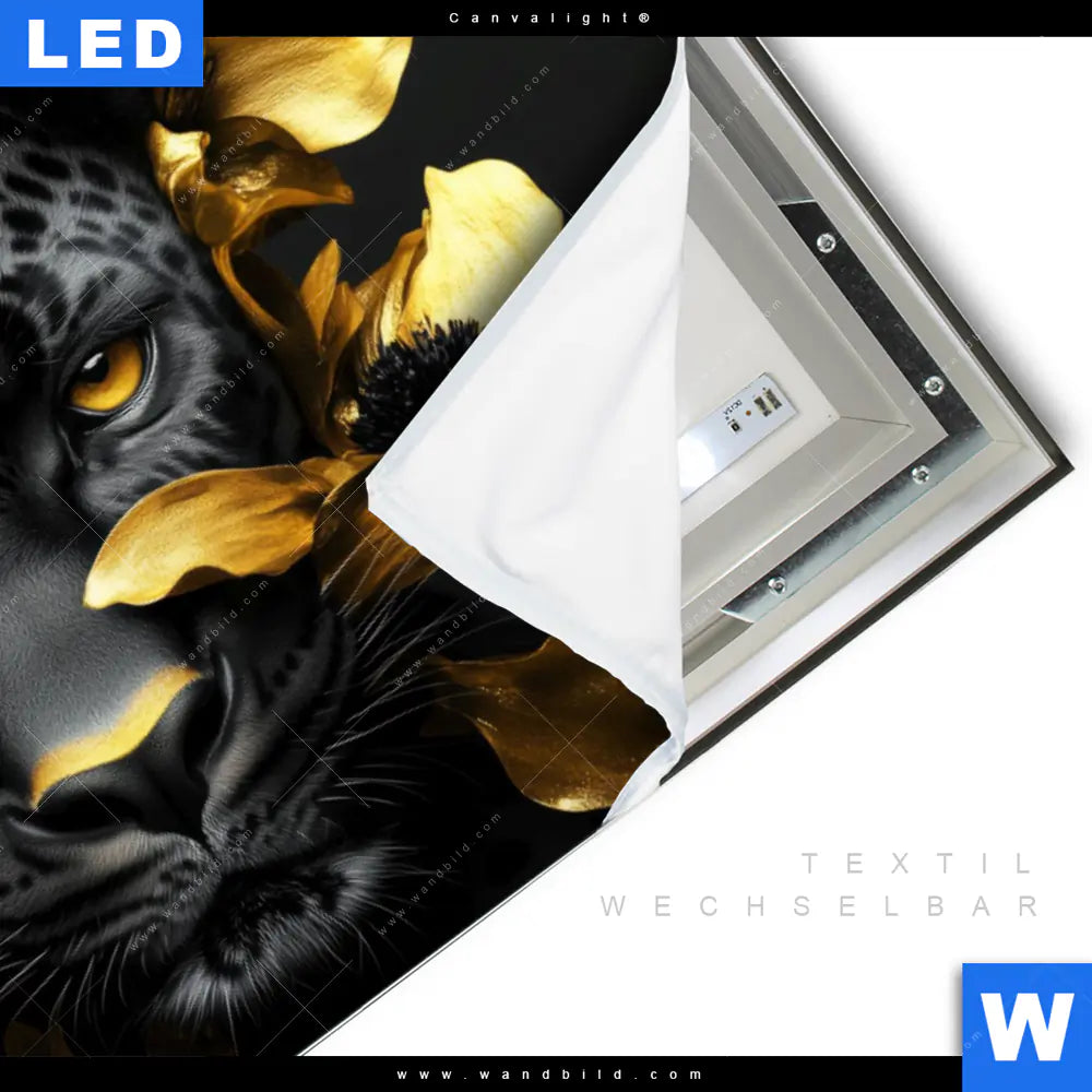 Canvalight® TEX Leuchtbild | Goldblumen & Panther | Querformat