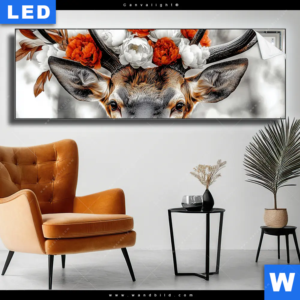 Canvalight® TEX Leuchtbild | Hirsch mit Blumenkrone | Panorama