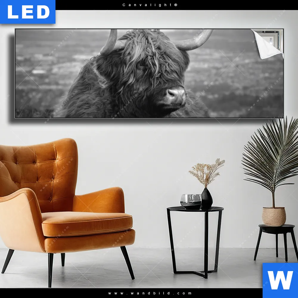 Canvalight® TEX Leuchtbild | Hochland-Rind Schwarz-Weiß No. 2 | Panorama