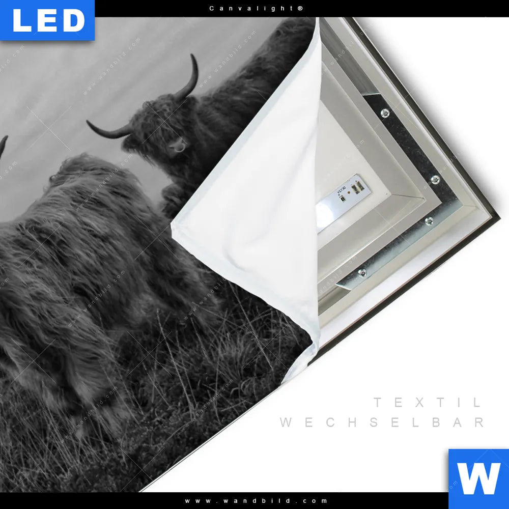 Canvalight® TEX Leuchtbild | Hochland-Rind Schwarz-Weiß | Querformat