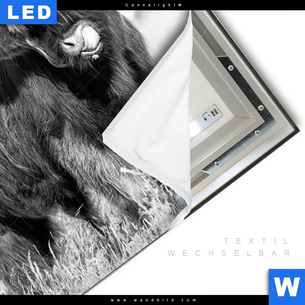 Canvalight® TEX Leuchtbild | Hochlandkuh auf einer Wiese | Quadrat