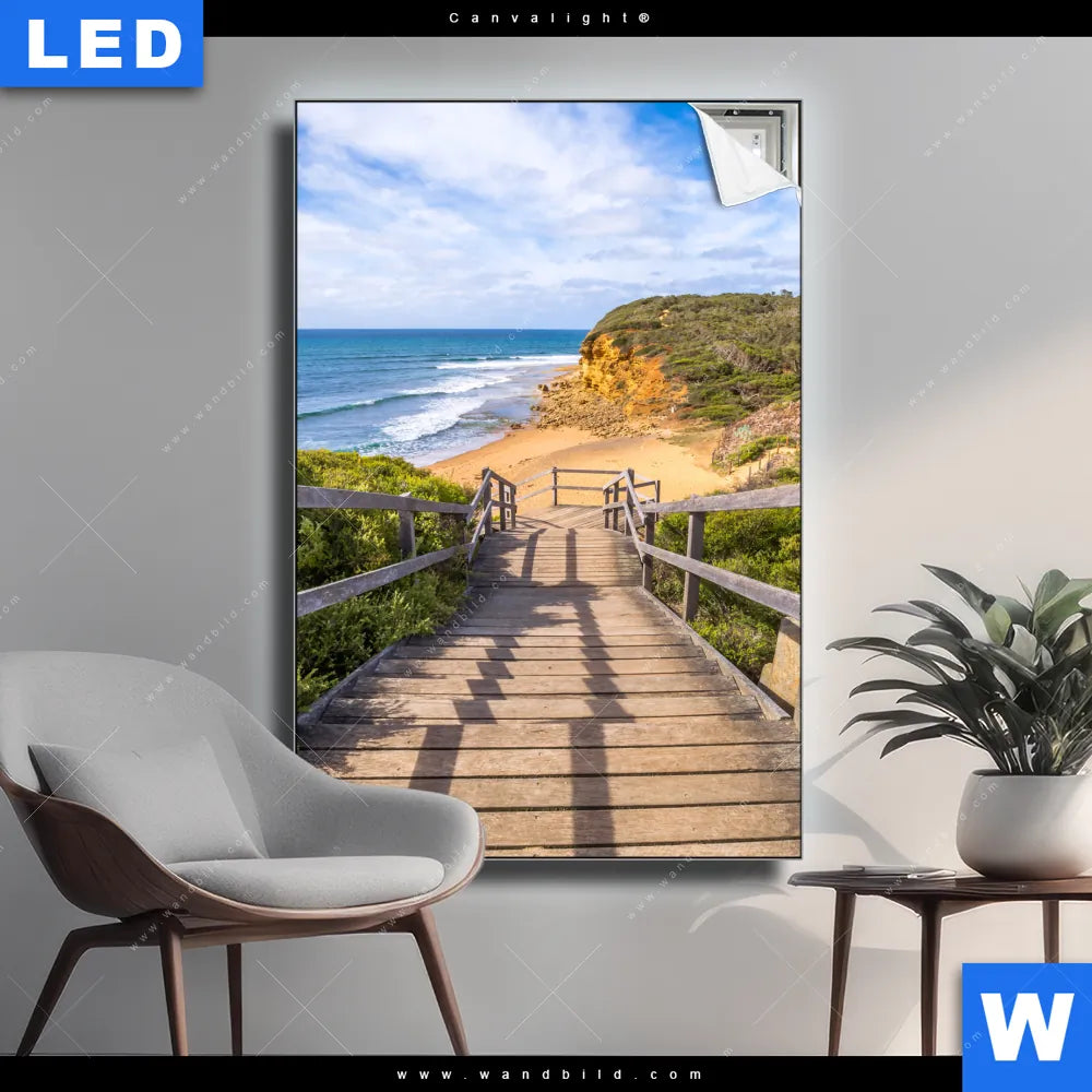 Canvalight® Leuchtbild | Holztreppe zum einsamen Strand | Hochformat