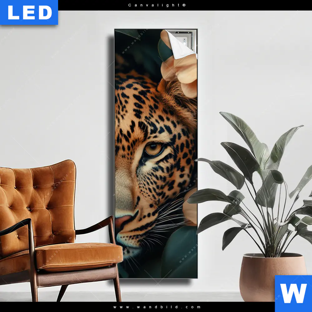 Canvalight® TEX Leuchtbild | Leopard im Blütenmeer | Schmal