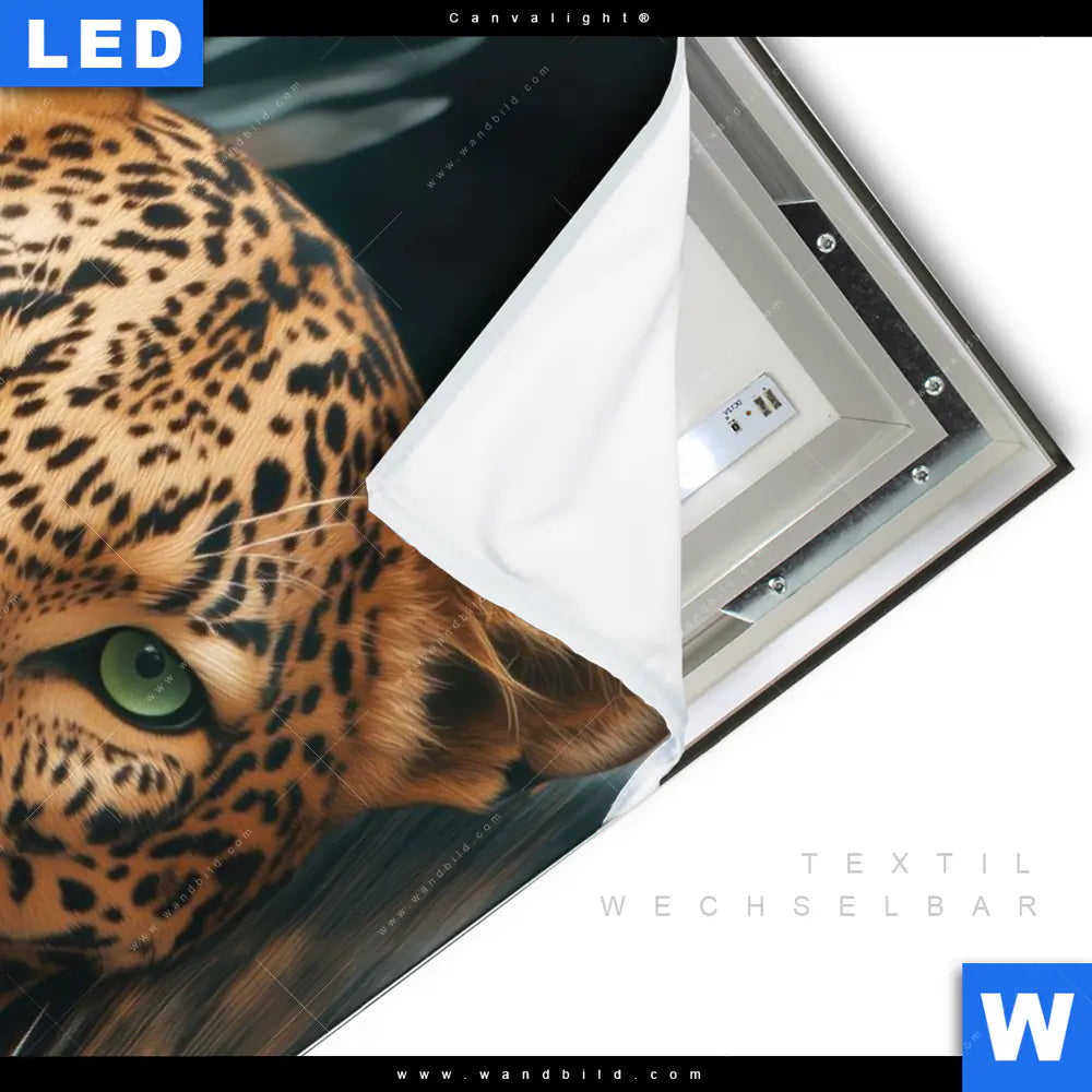 Canvalight® TEX Leuchtbild | Leopard zwischen Blättern | Hochformat