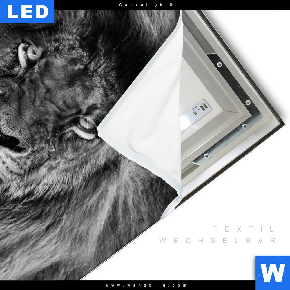 Canvalight® TEX Leuchtbild | Löwe Schwarzweiß | Hochformat