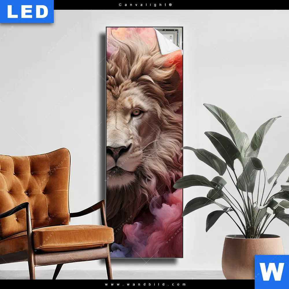 Canvalight® TEX Leuchtbild | Löwengesicht in buntem Rauch | Schmal