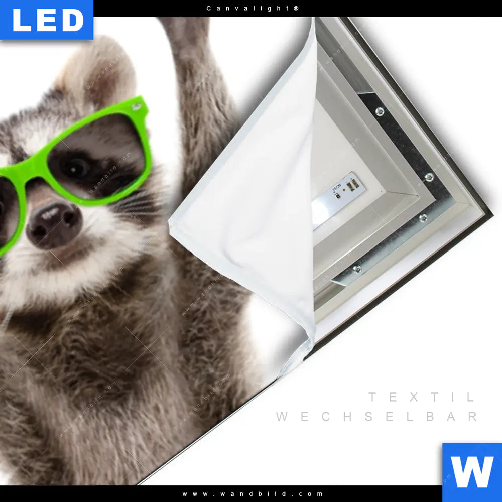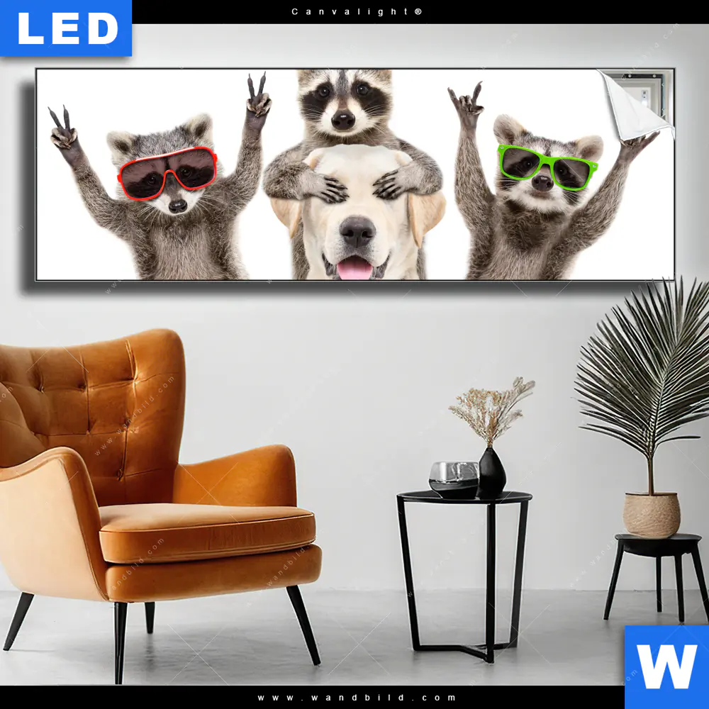 Canvalight® TEX Leuchtbild | Lustige Waschbären mit Hund | Panorama