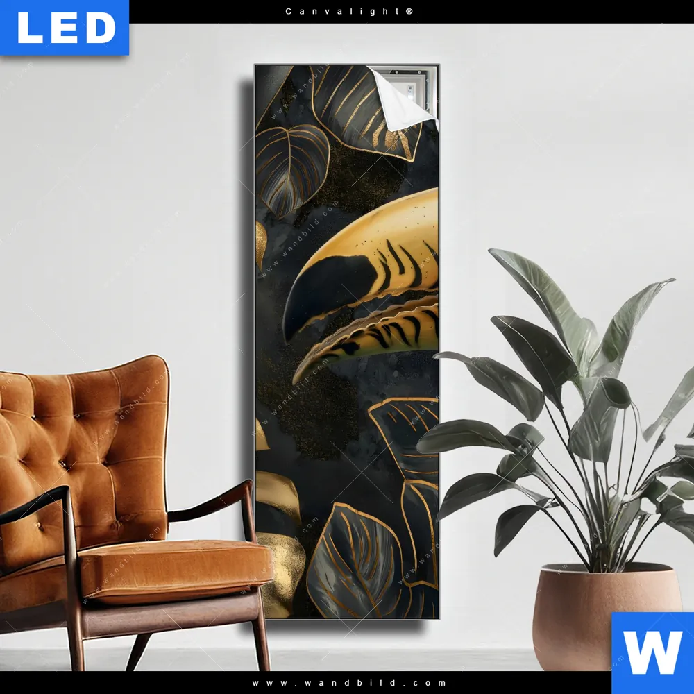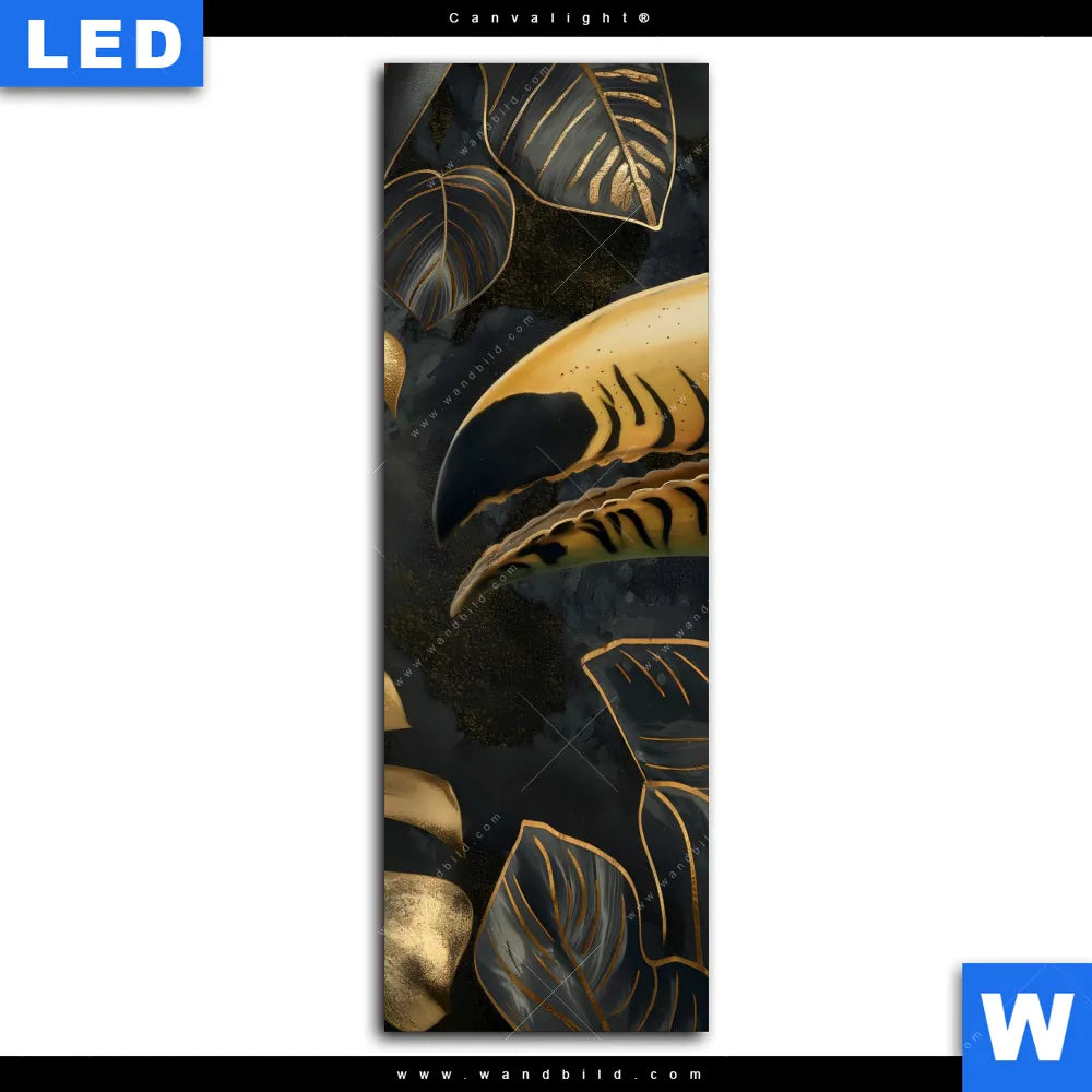 Canvalight® Leuchtbild | Monstera und Tukan Gold | Schmal