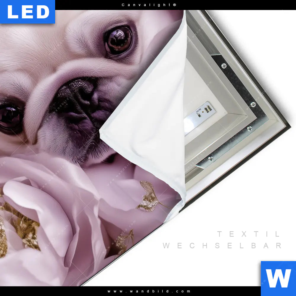Canvalight® TEX Leuchtbild | Mops im Blütenmeer | Quadrat