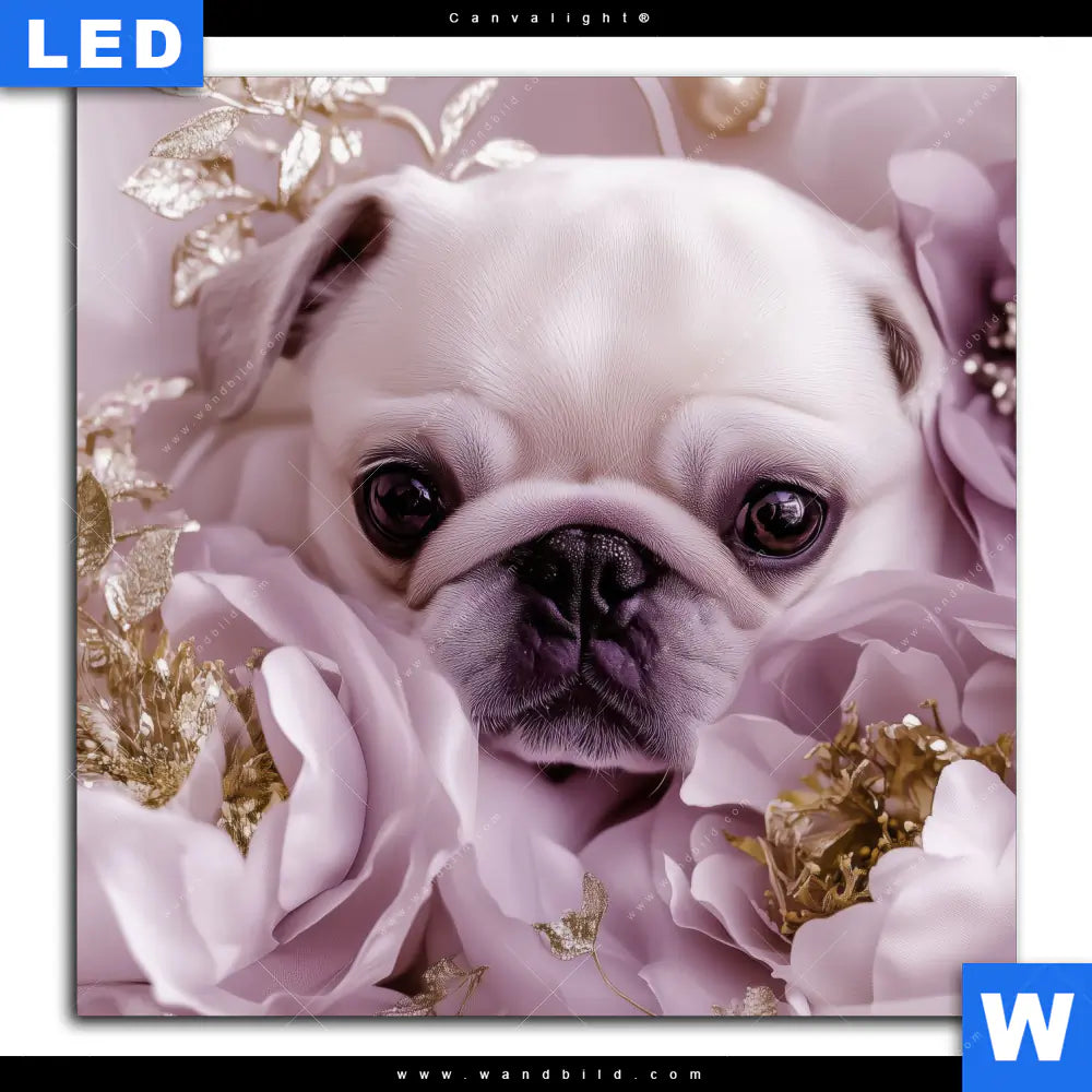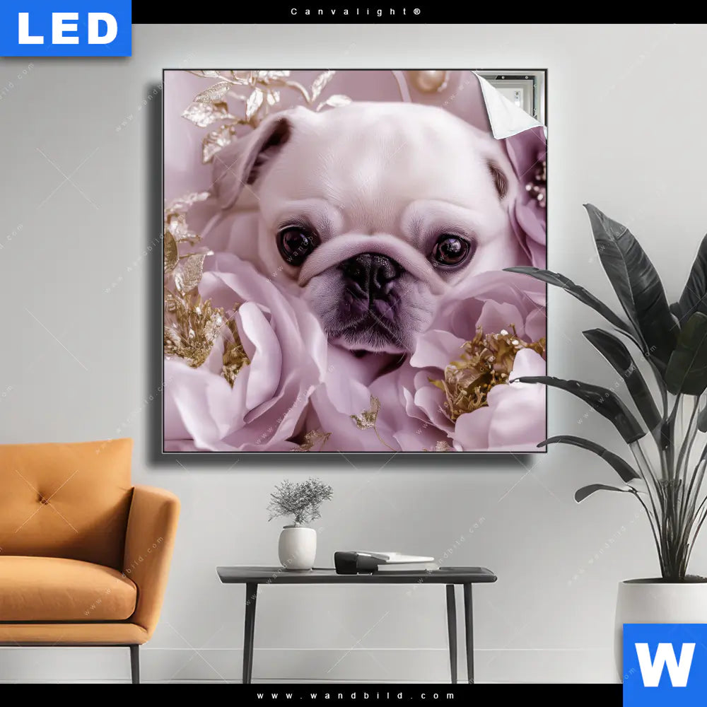 Canvalight® Leuchtbild | Mops im Blütenmeer | Quadrat