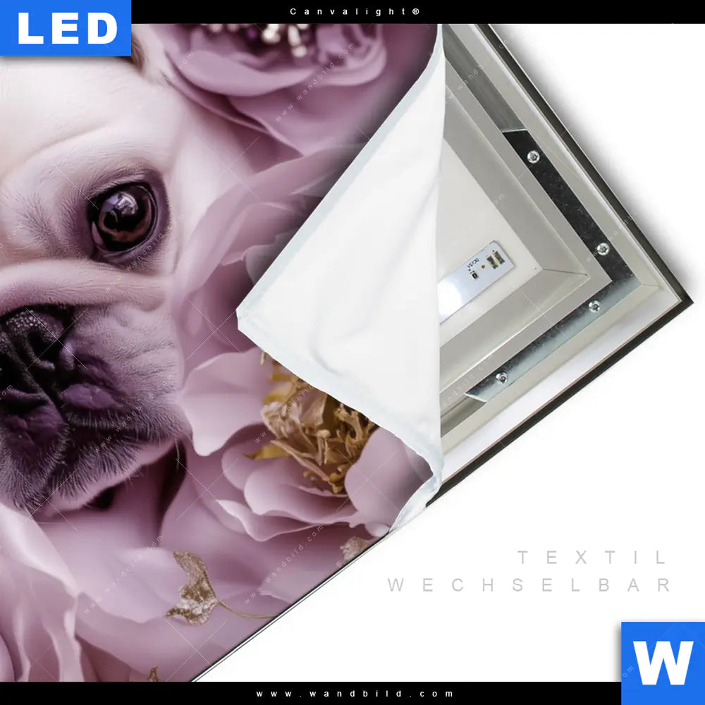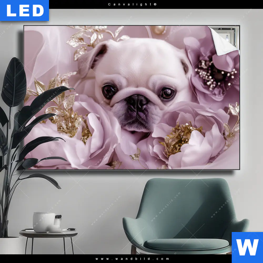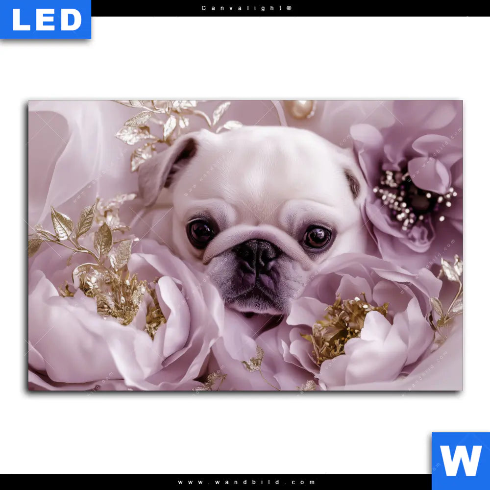 Canvalight® Leuchtbild | Mops im Blütenmeer | Querformat