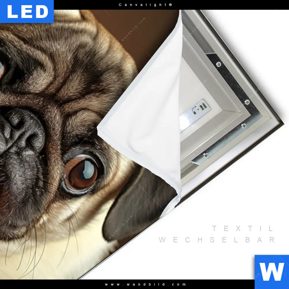 Canvalight® TEX Leuchtbild | Mops mit Cheeseburger | Hochformat
