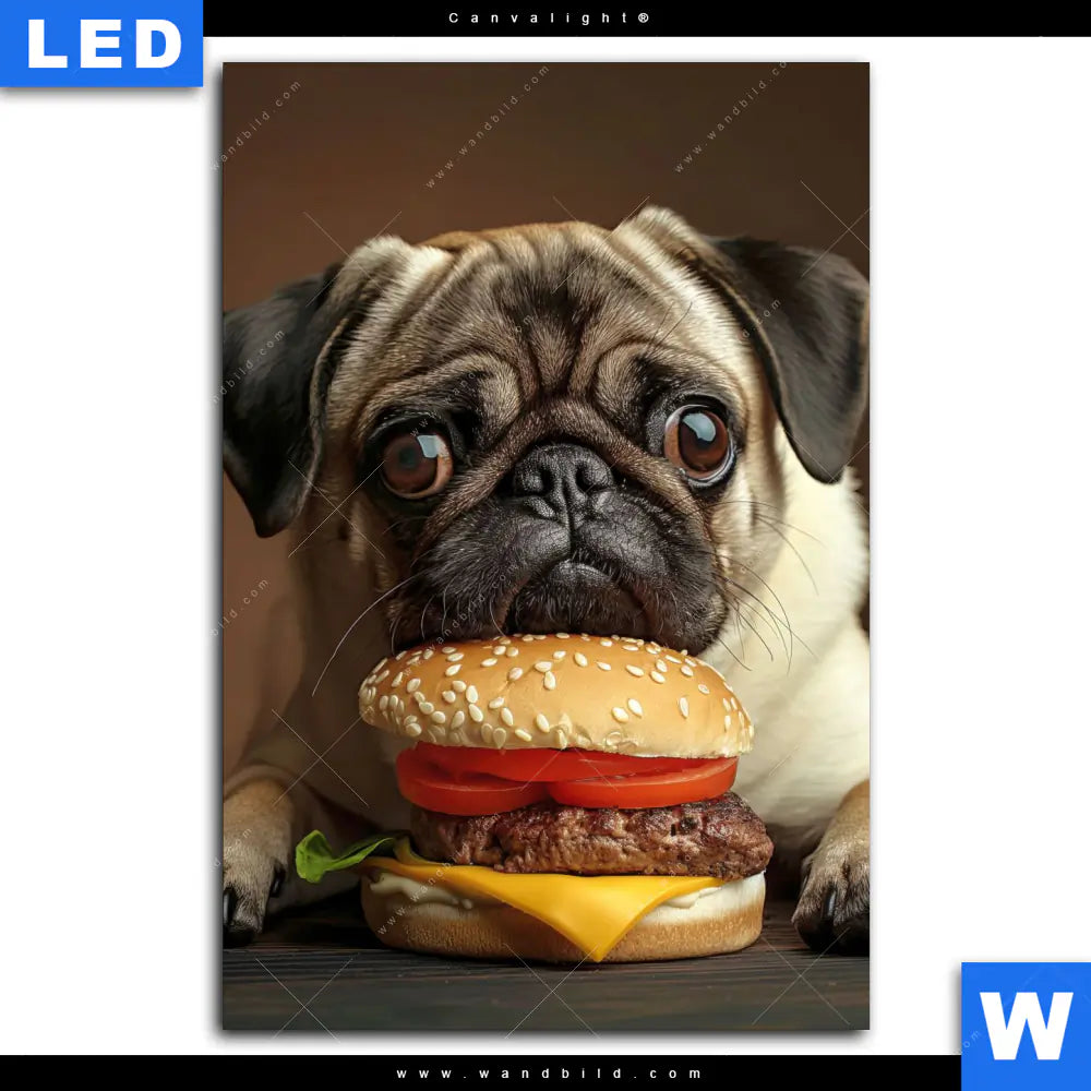 Canvalight® Leuchtbild | Mops mit Cheeseburger | Hochformat