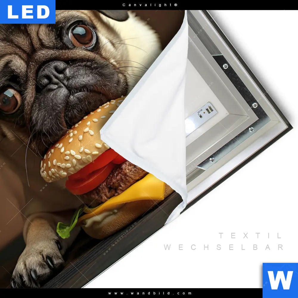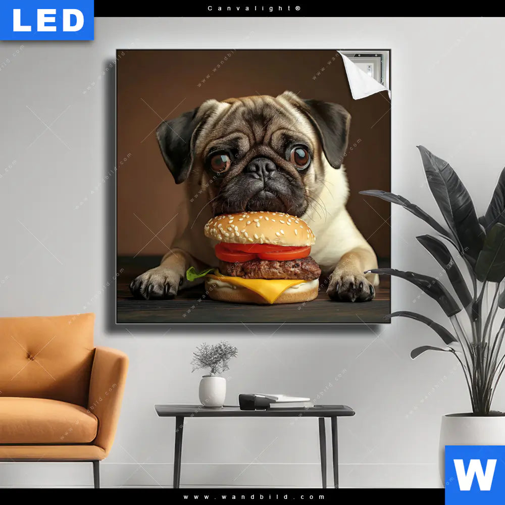 Canvalight® TEX Leuchtbild | Mops mit Cheeseburger | Quadrat