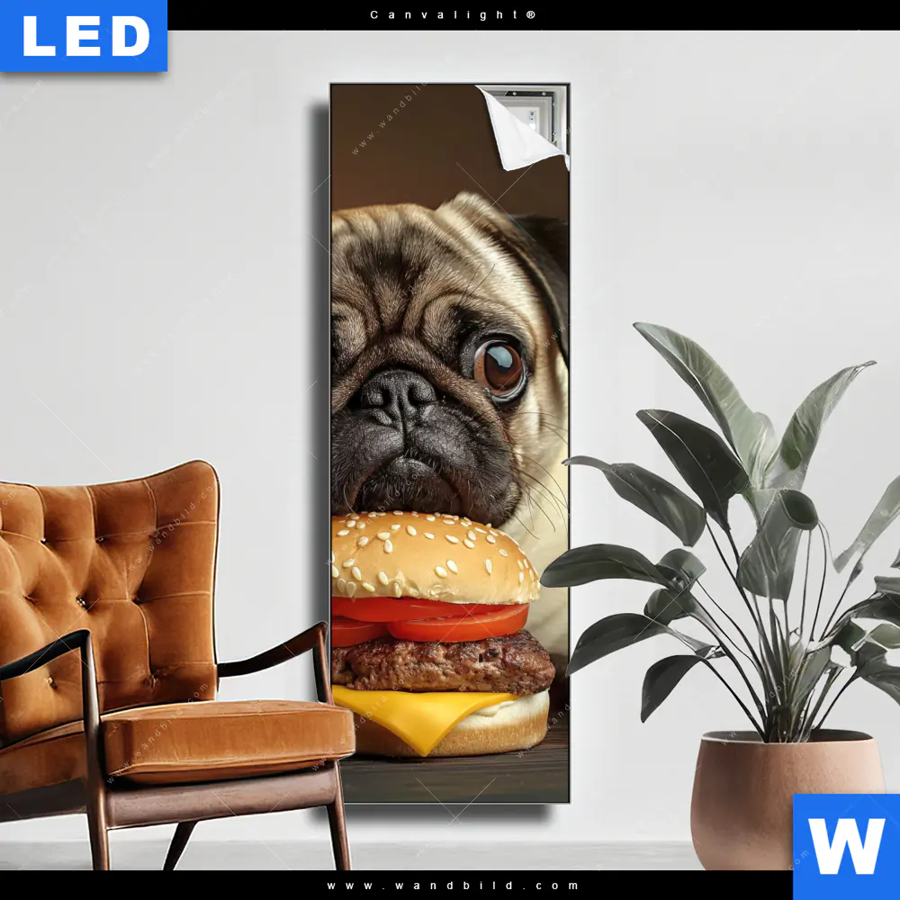 Canvalight® Leuchtbild | Mops mit Cheeseburger | Schmal