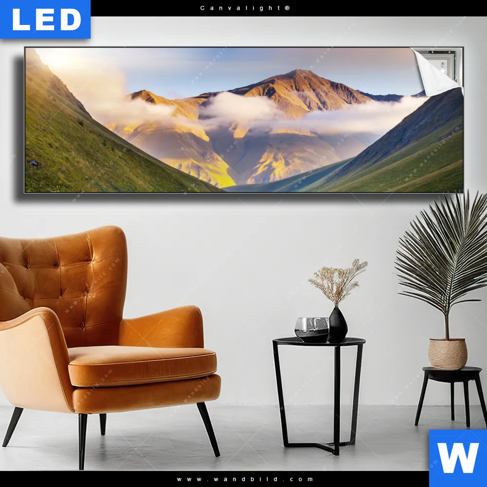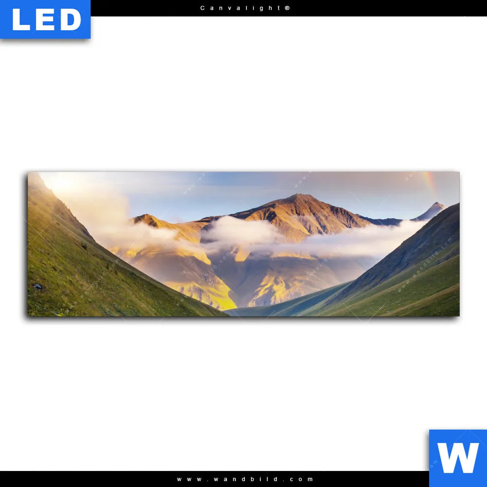 Canvalight® TEX Leuchtbild | Nebel und Regenbogen zwischen den Bergen | Panorama