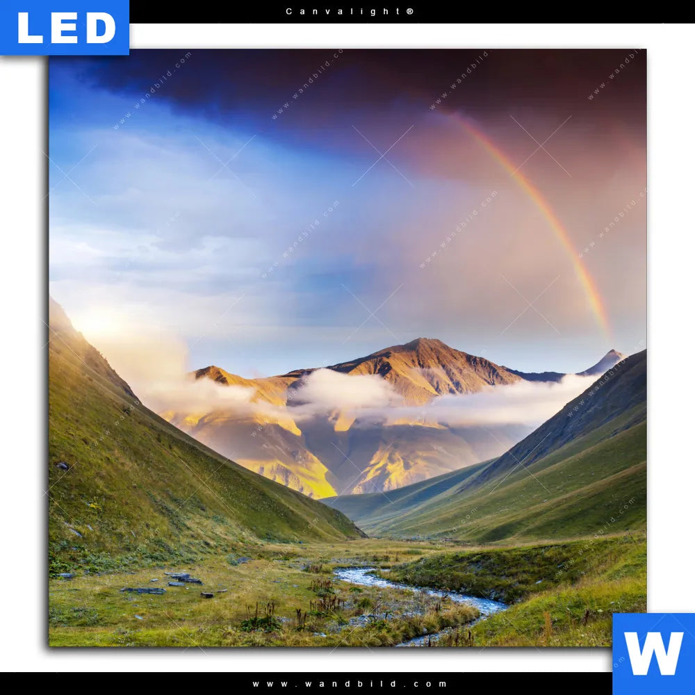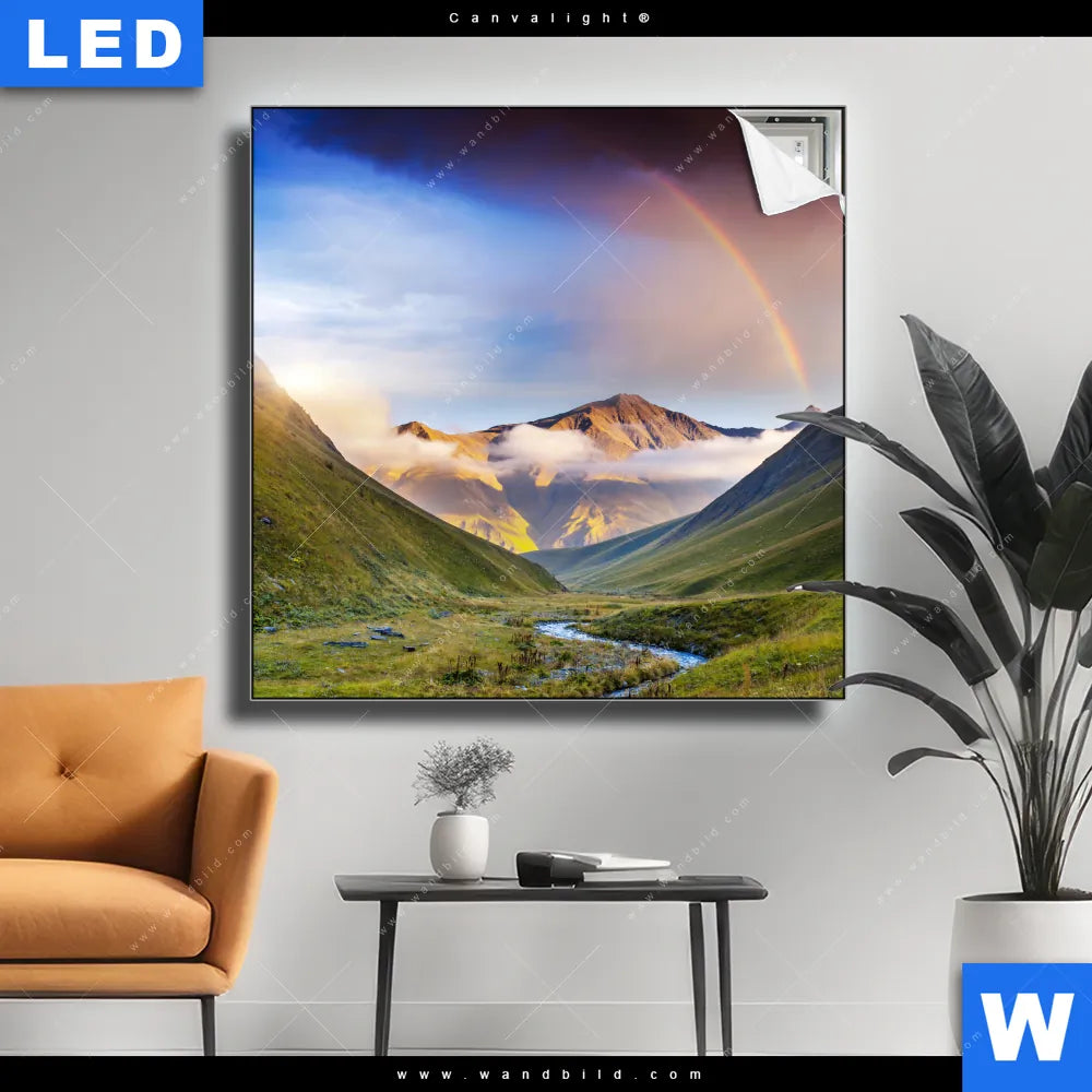 Canvalight® TEX Leuchtbild | Nebel und Regenbogen zwischen den Bergen | Quadrat