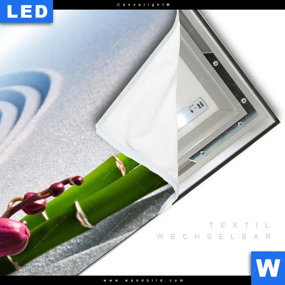 LED-Textilrahmen-Bild mit austauschbarem Buddha - Feng Shui, Blumen - Botanik Textil-Druck (Wechselbild)
