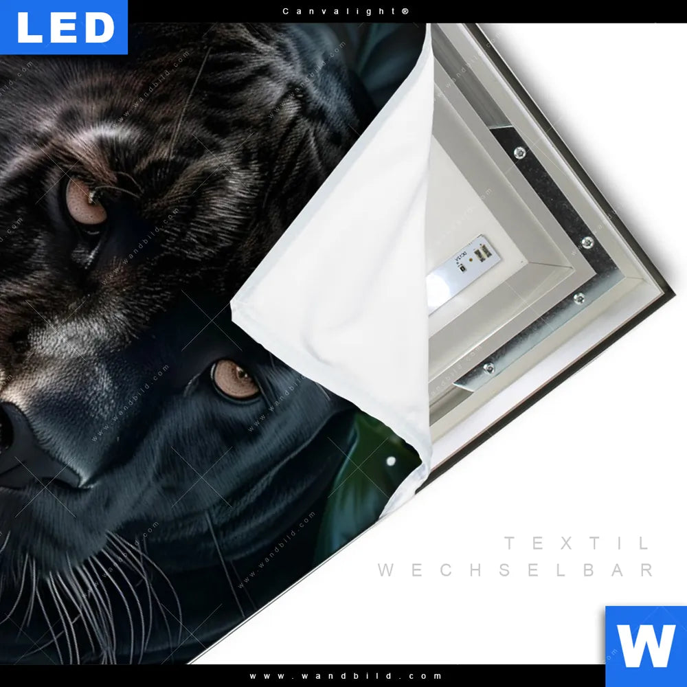 Canvalight® TEX Leuchtbild | Panther und rote Blüten | Hochformat
